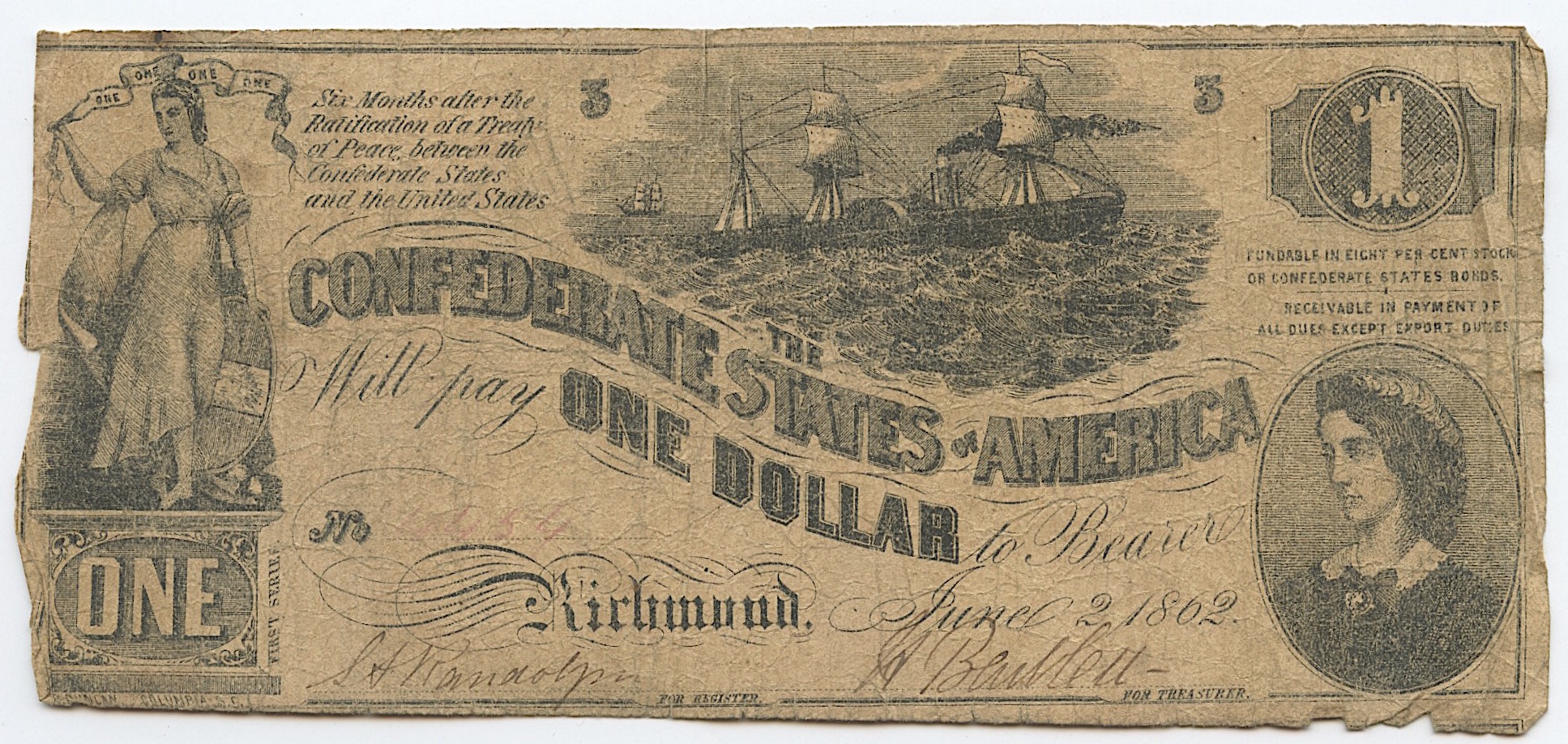 1862 $1 One Dollar Confederate States of America Richmond CSA Bank Note Bill (T-44)