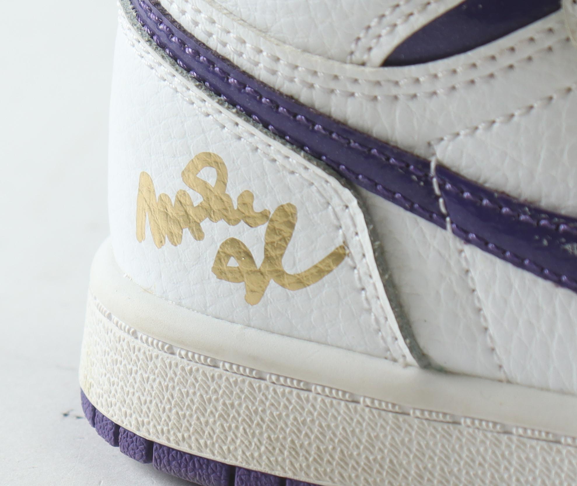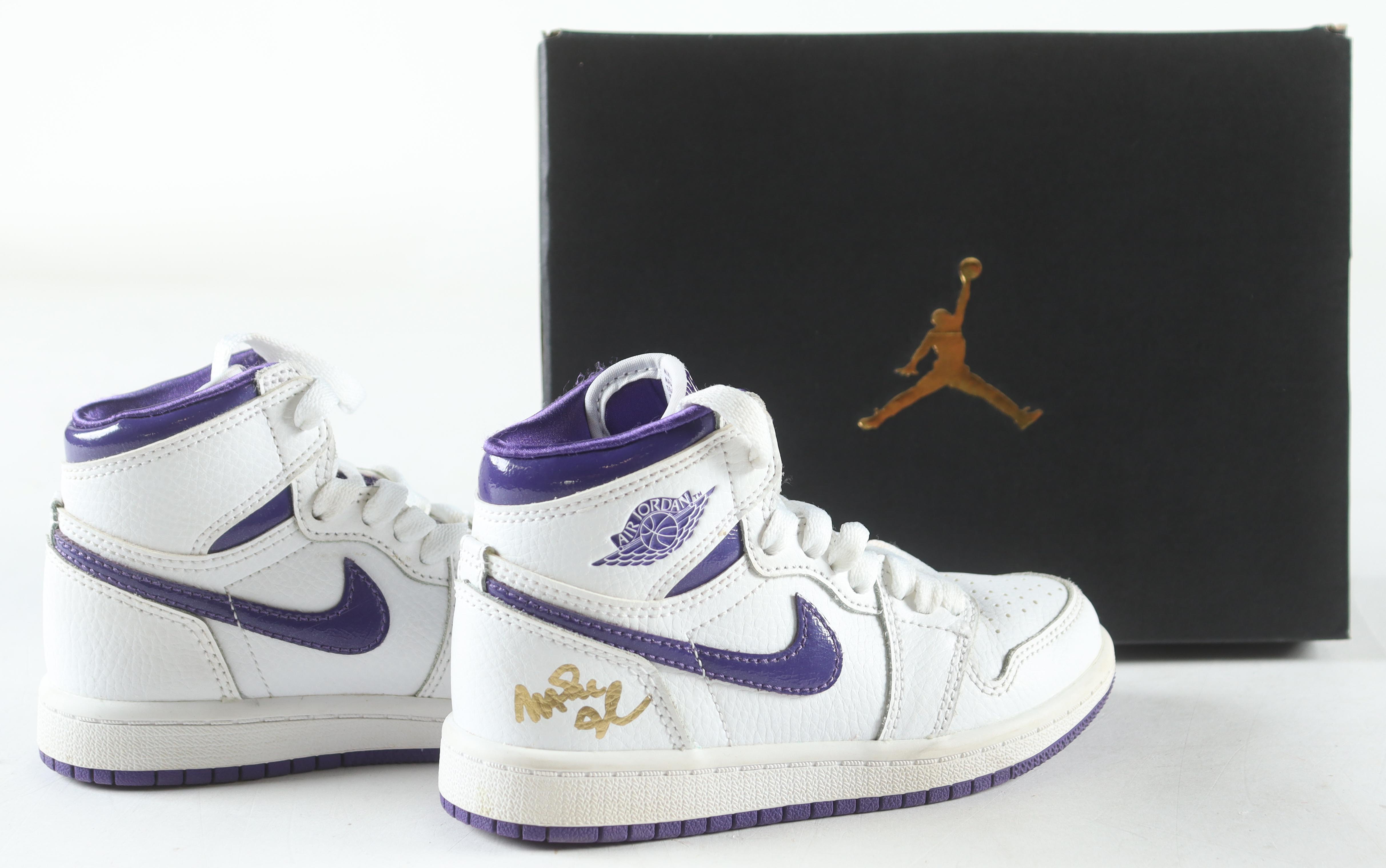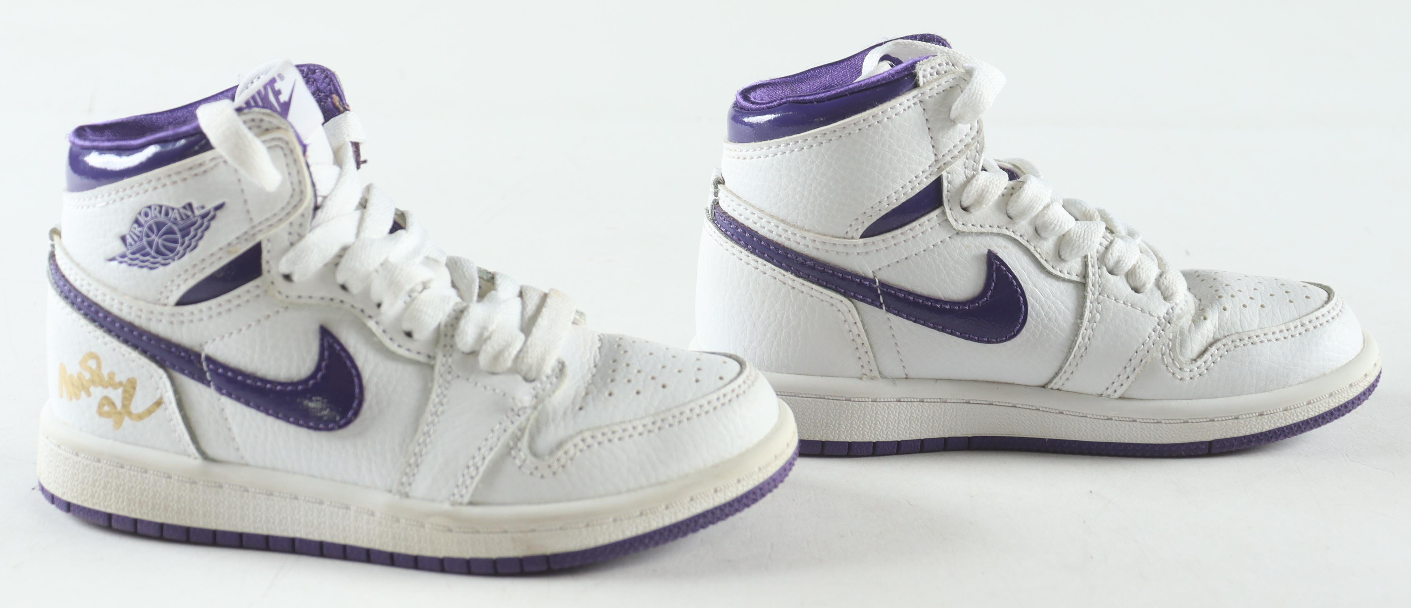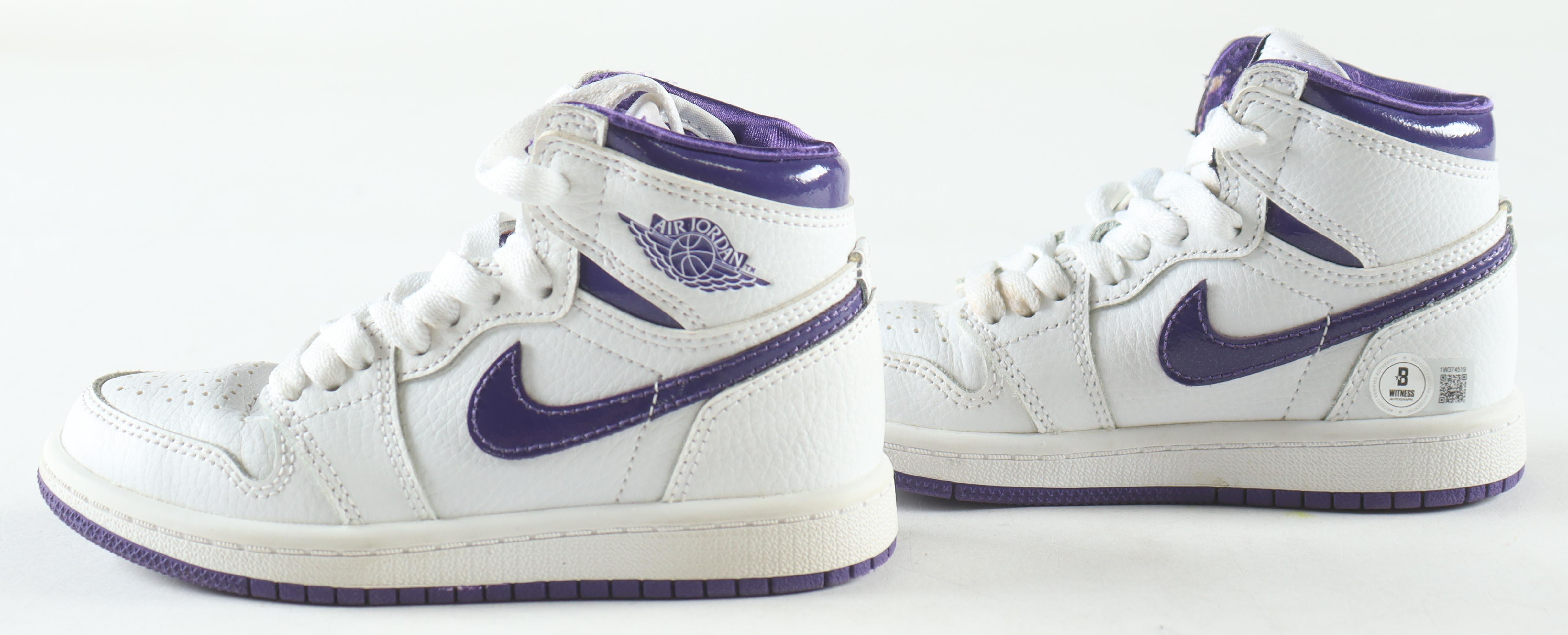 Nike Air Jordan 1 High OG (PS) white / court purple, size 11C. The right has been hand signed by Magic Johnson (Los Angeles Lakers, HOF).