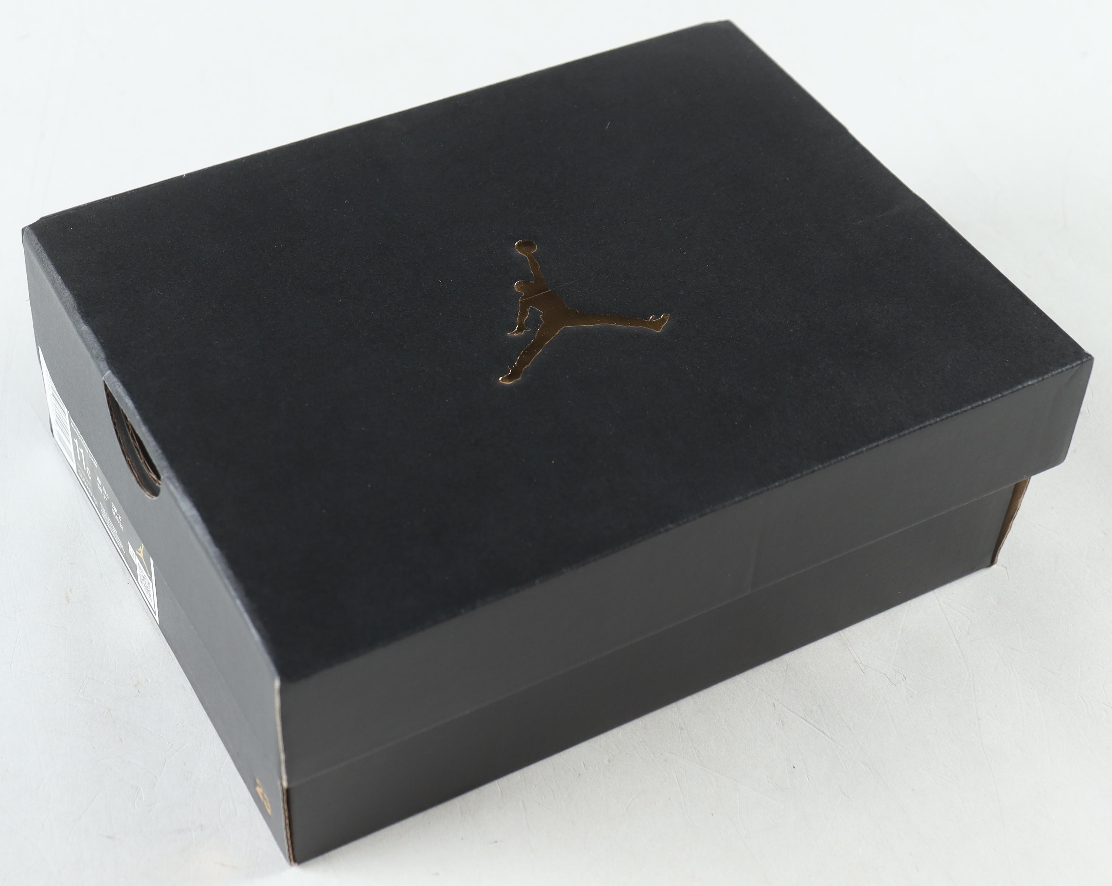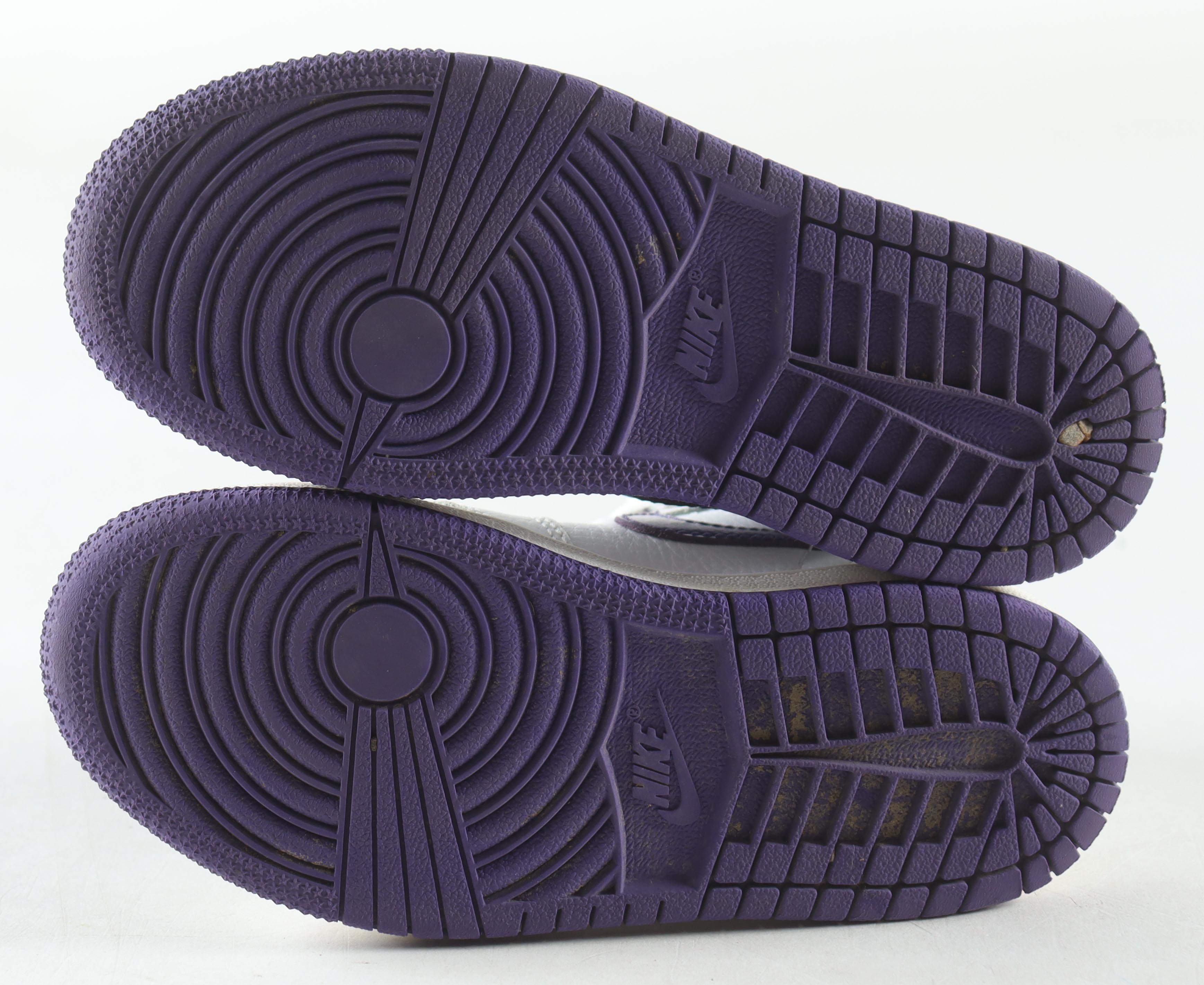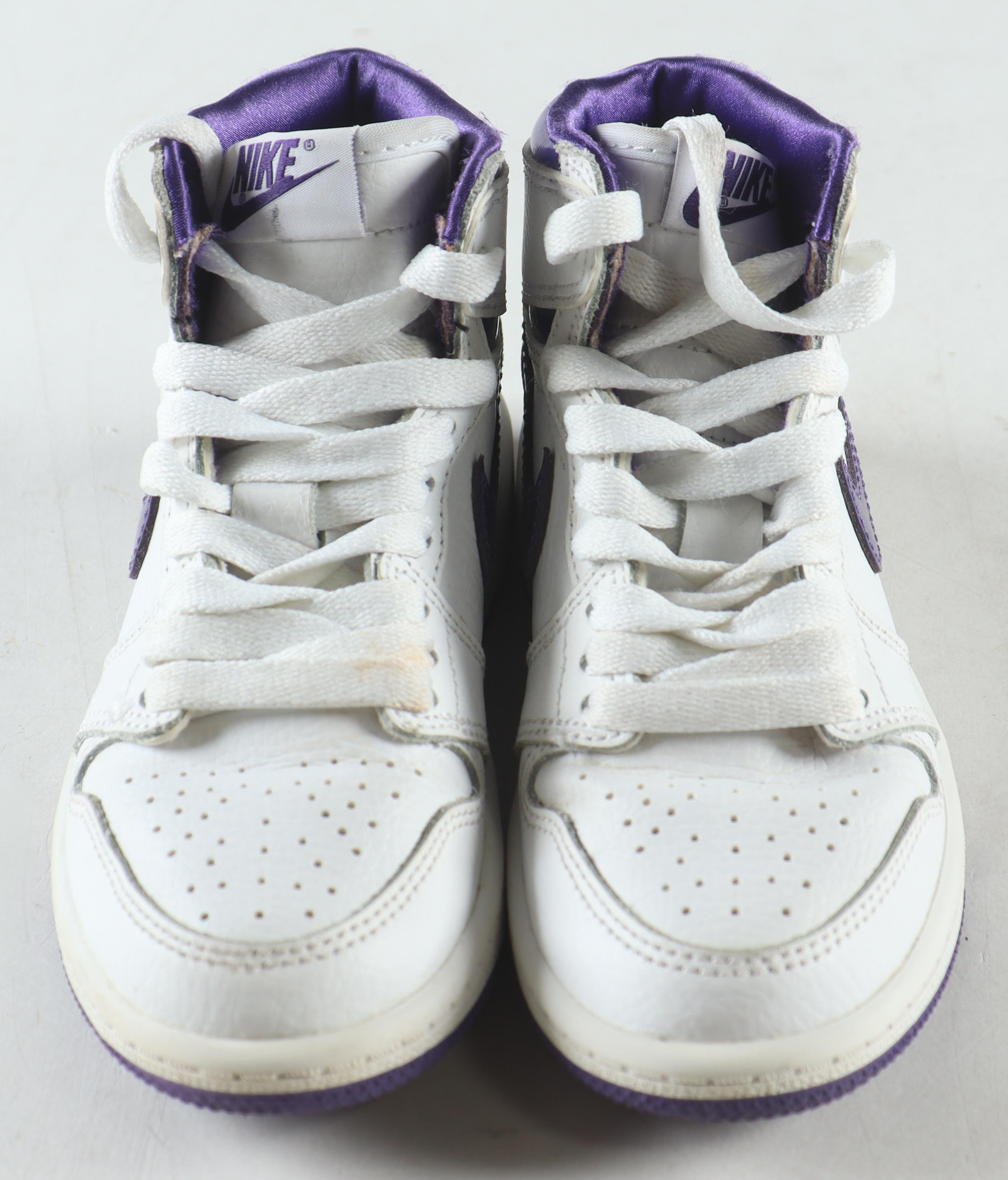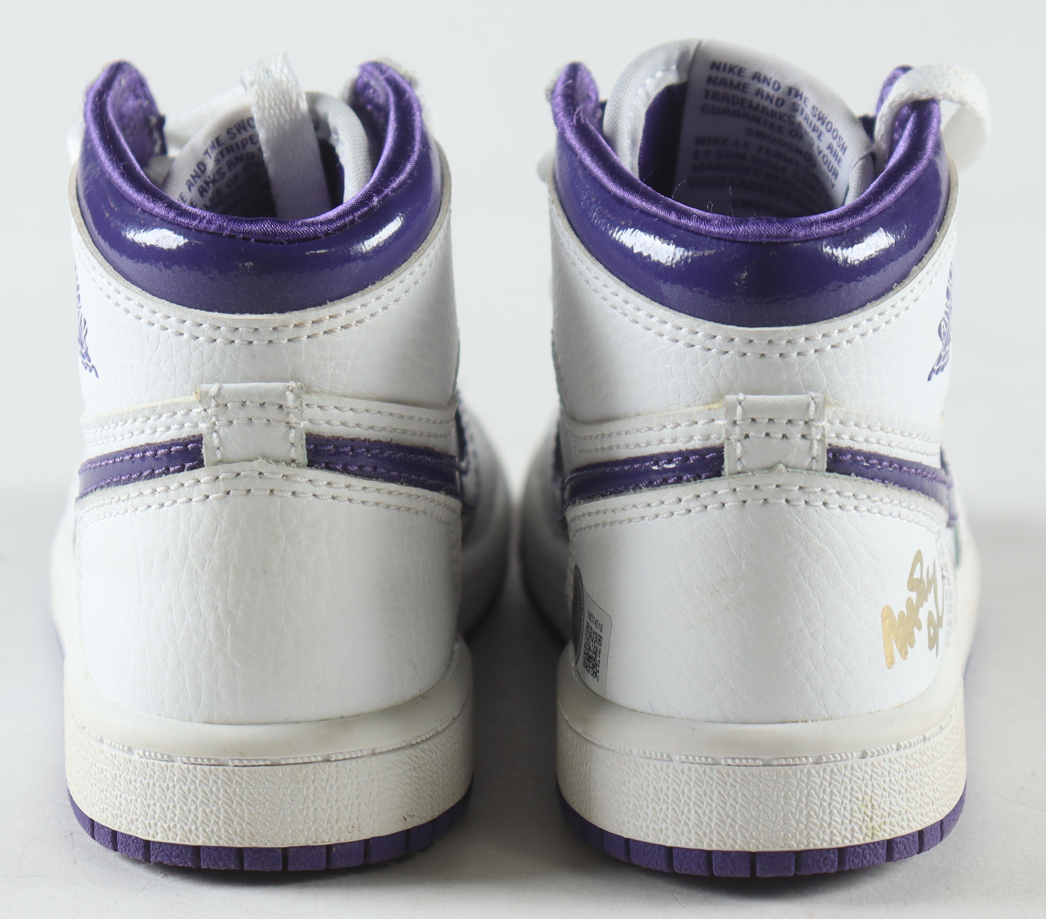 Nike Air Jordan 1 High OG (PS) white / court purple, size 11C. The right has been hand signed by Magic Johnson (Los Angeles Lakers, HOF).
