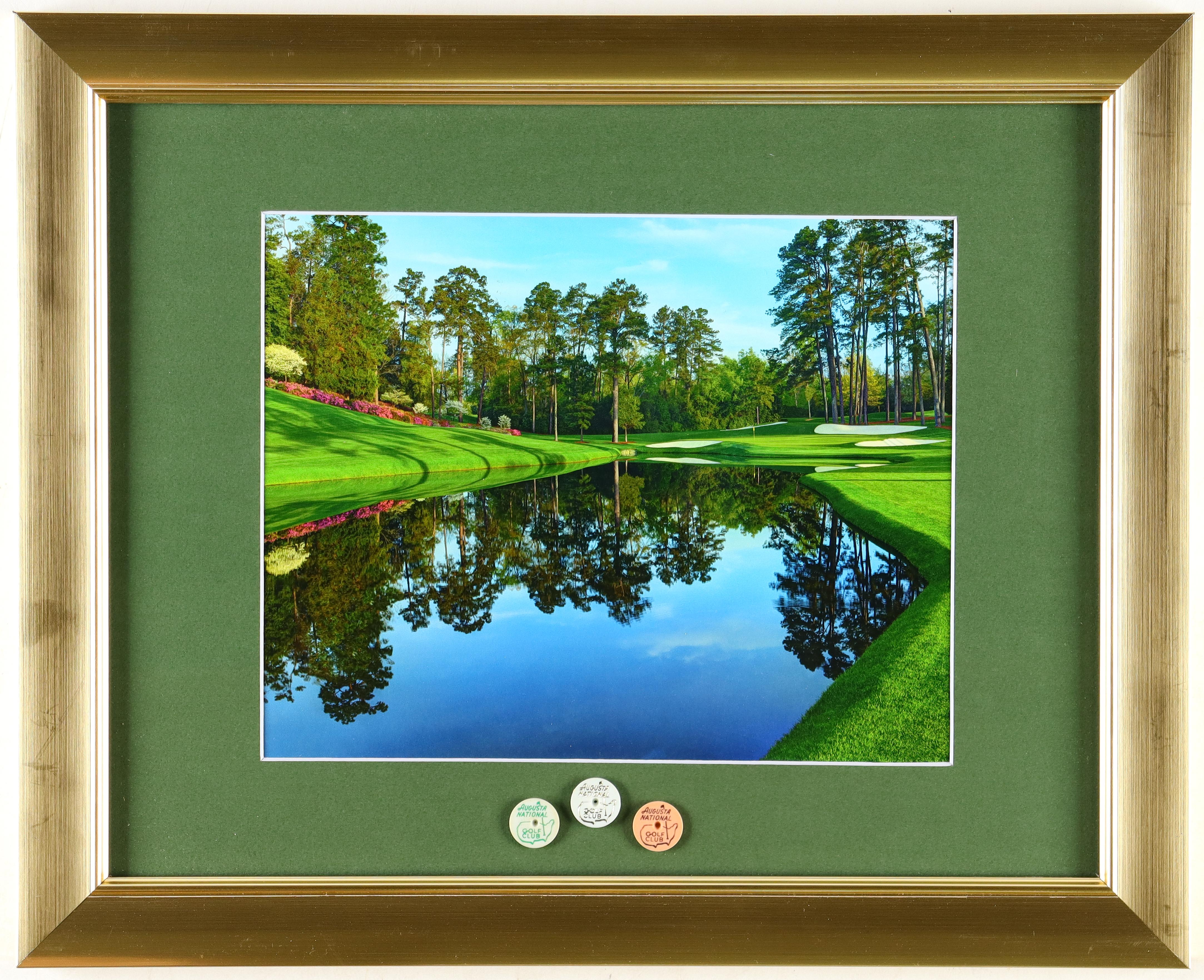 Custom frame measures approximately 13" x 16" in size and features an unsigned course photo as well as (3) official Masters ball markers. Please note, there is scuffing on the frame.