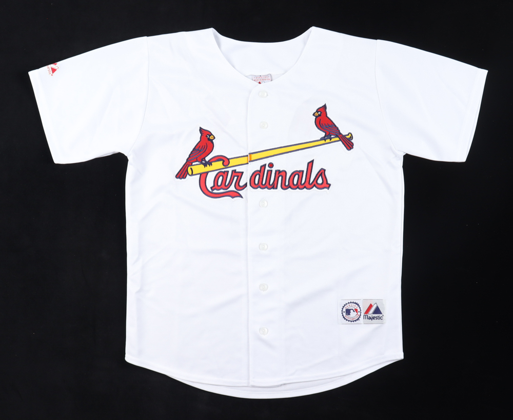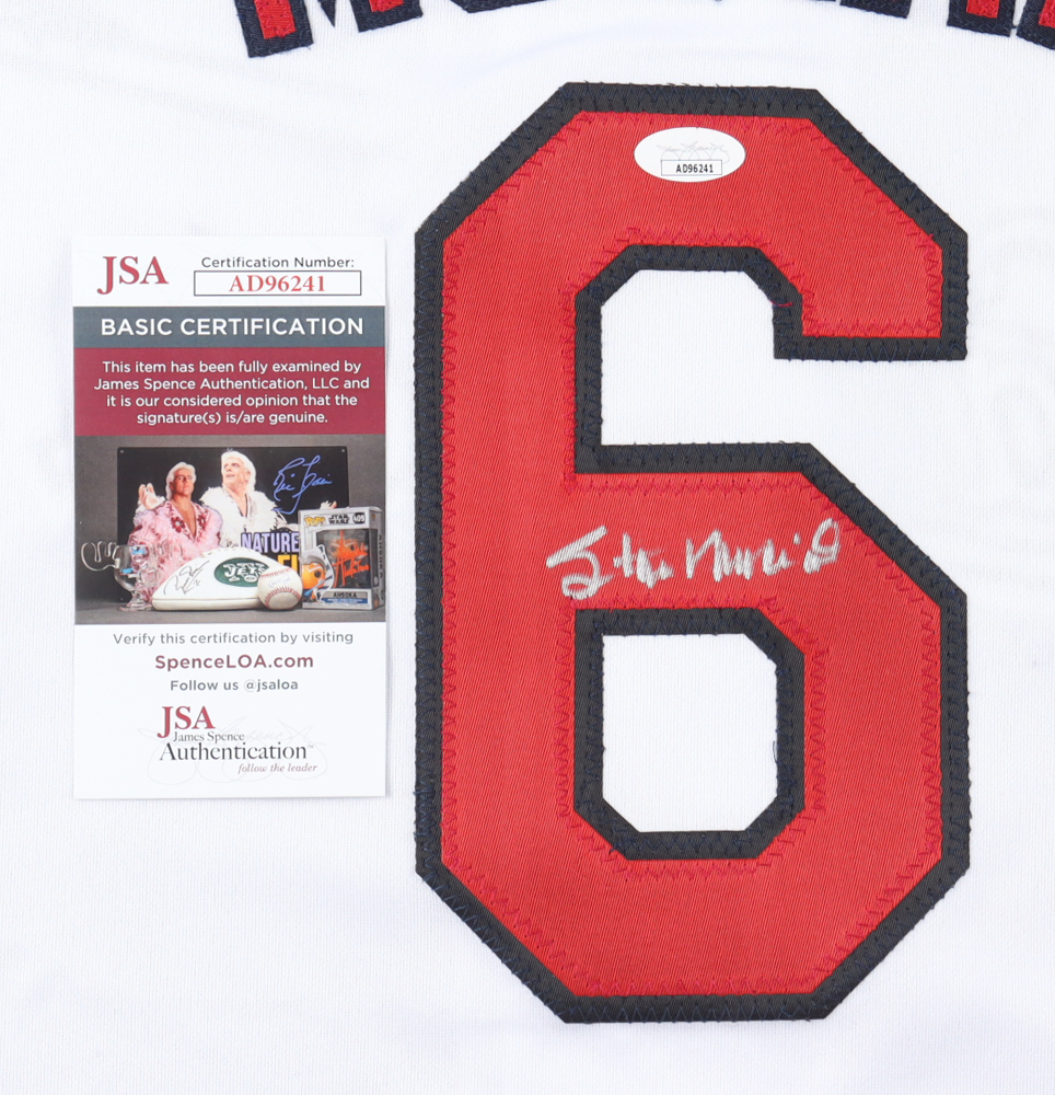 Majestic jersey with everything sewn on, size M. Hand-signe by Stan Musial (D. 2013, St. Louis Cardinals, HOF). Please. note, there is a stain near the reverse number.