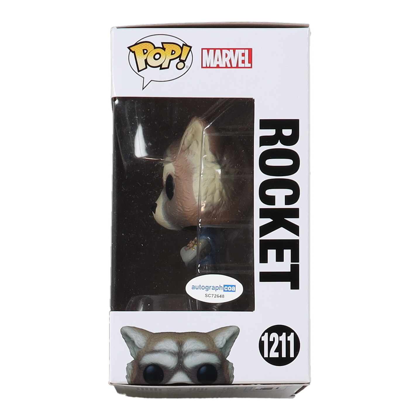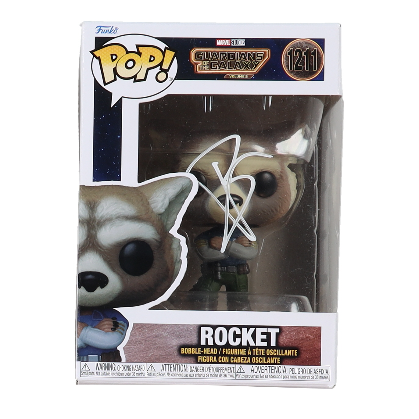 Bobble-Head vinyl figure measures approximately 4" tall and has been hand-signed on the packaging by Bradley Cooper (Rocket).