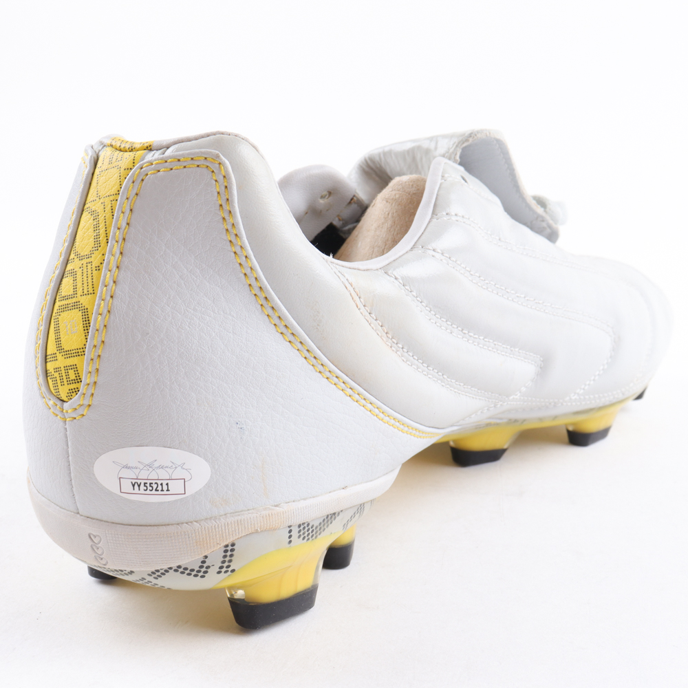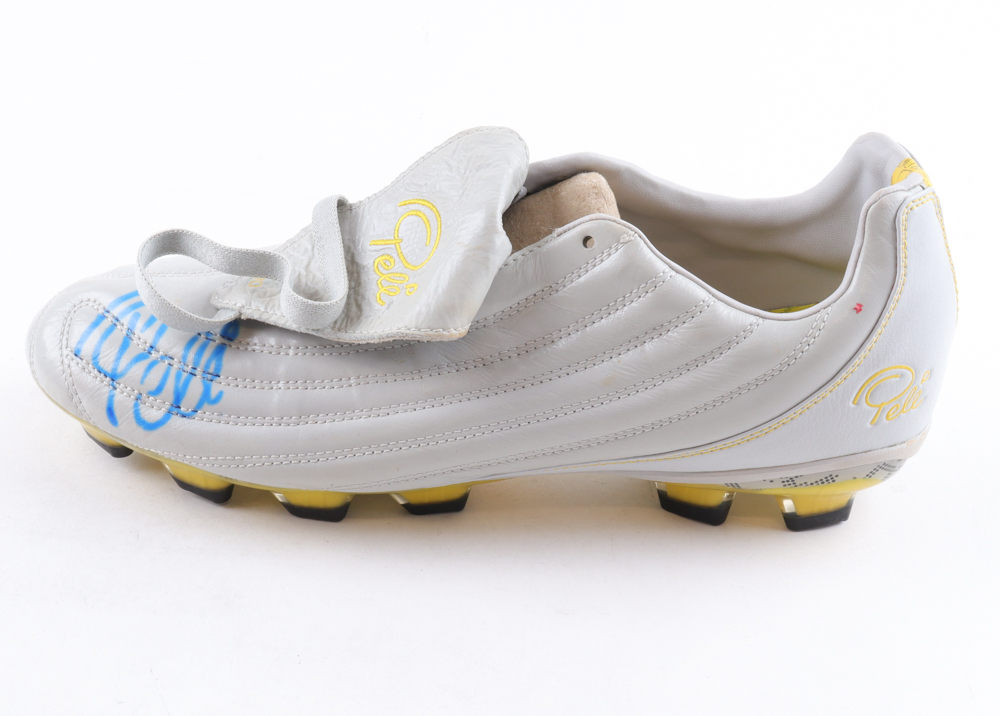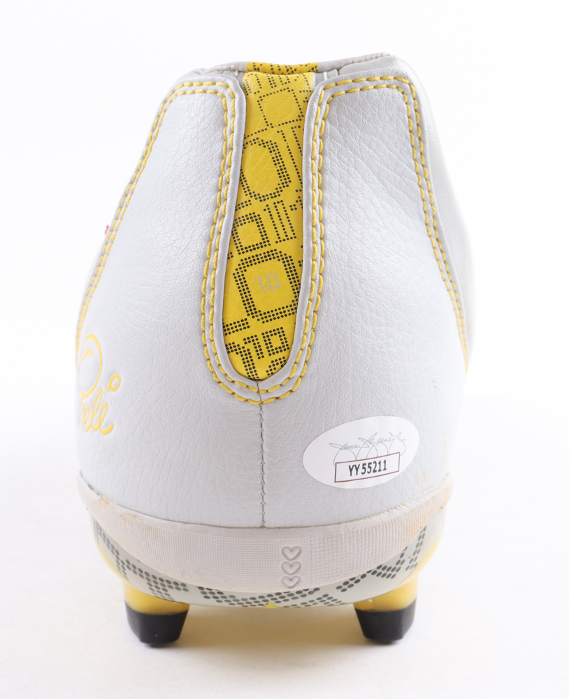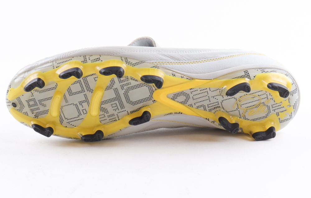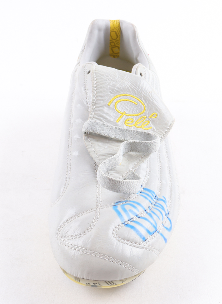 Pele soccer cleat has been hand-signed by Pele (D. 2022, Brazilian National Team, HOF). Please note, the signature has bled.