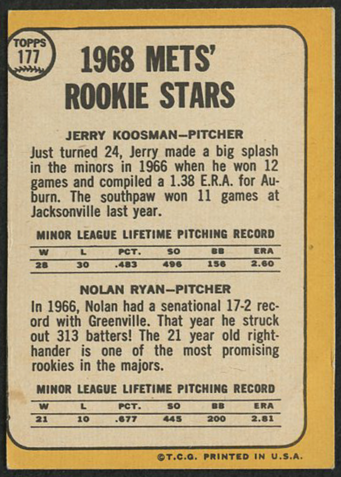 1968 Topps #177 Rookie Stars / Jerry Koosman RC / Nolan Ryan RC