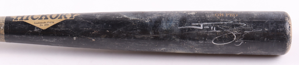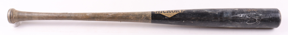 Old Hickory baseball bat. Hand-signed by Jonny Gomes (Tampa Bay Rays). The bat has been game-used by an unknown player and shows associated scuffing.
