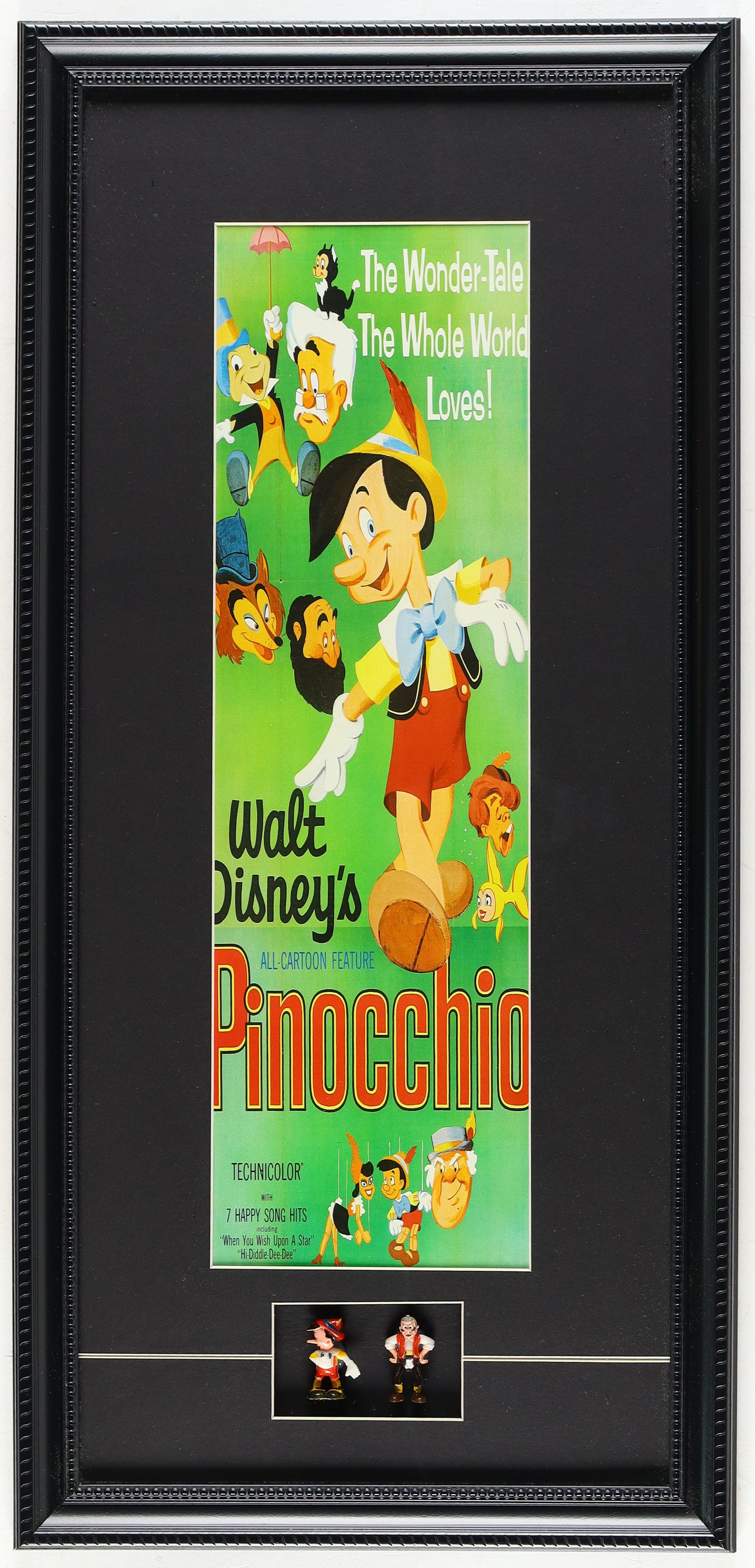 Walt Disney's "Pinocchio" Custom Framed Print with (2) Vintage 1960 Pinocchio & Gepetto Ceramic Figures