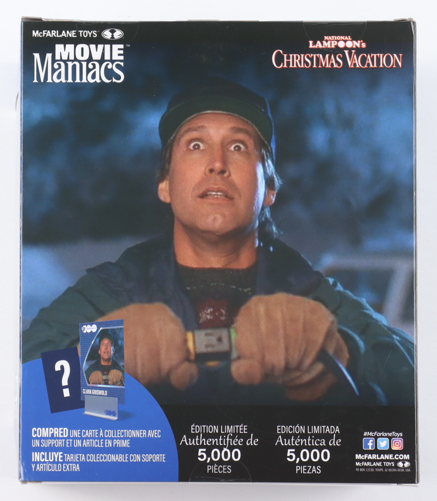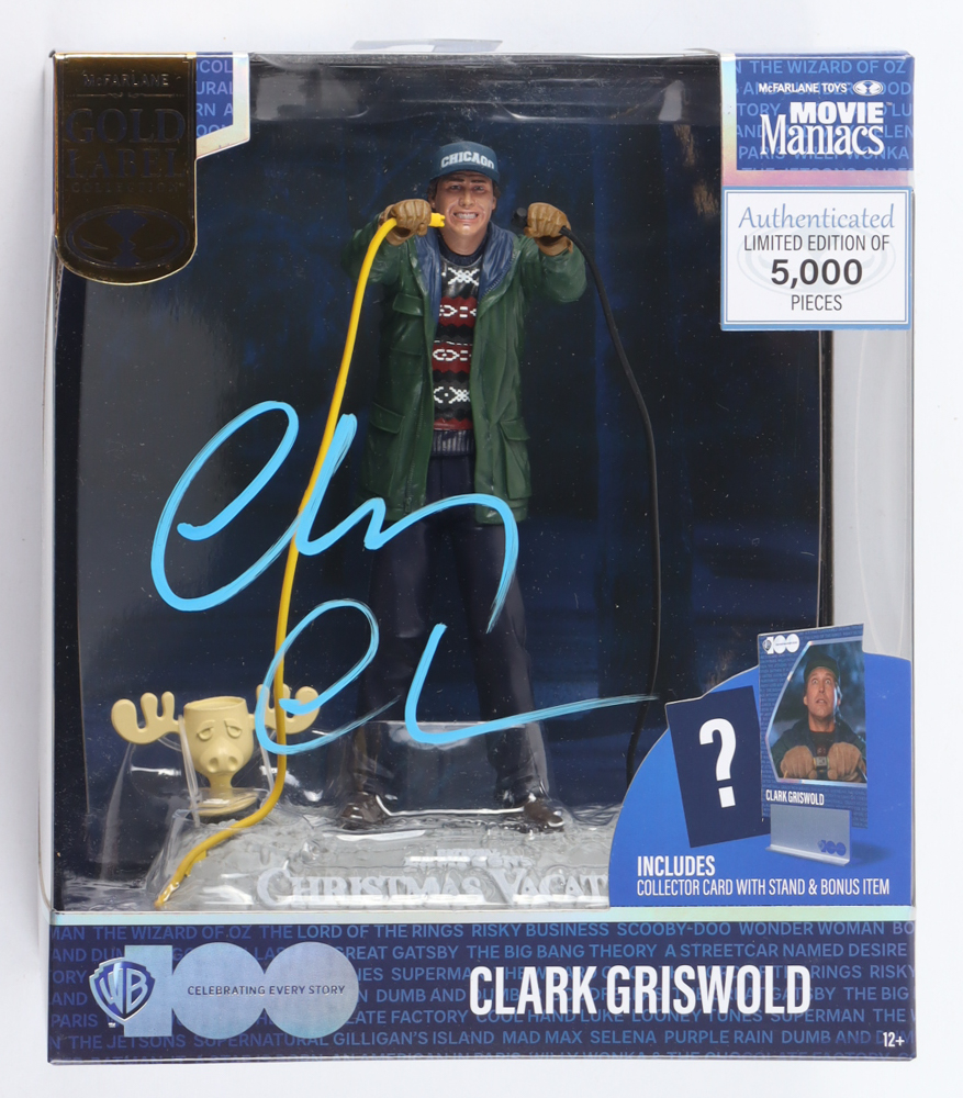 Gold Label Collection Movie Maniacs McFarlane Toys figurine measures approximately 6" in height and has been hand-signed on the front of the packaging by Chevy Chase (Clark W. Griswold). Please note, there is some corner wear on the packaging.
