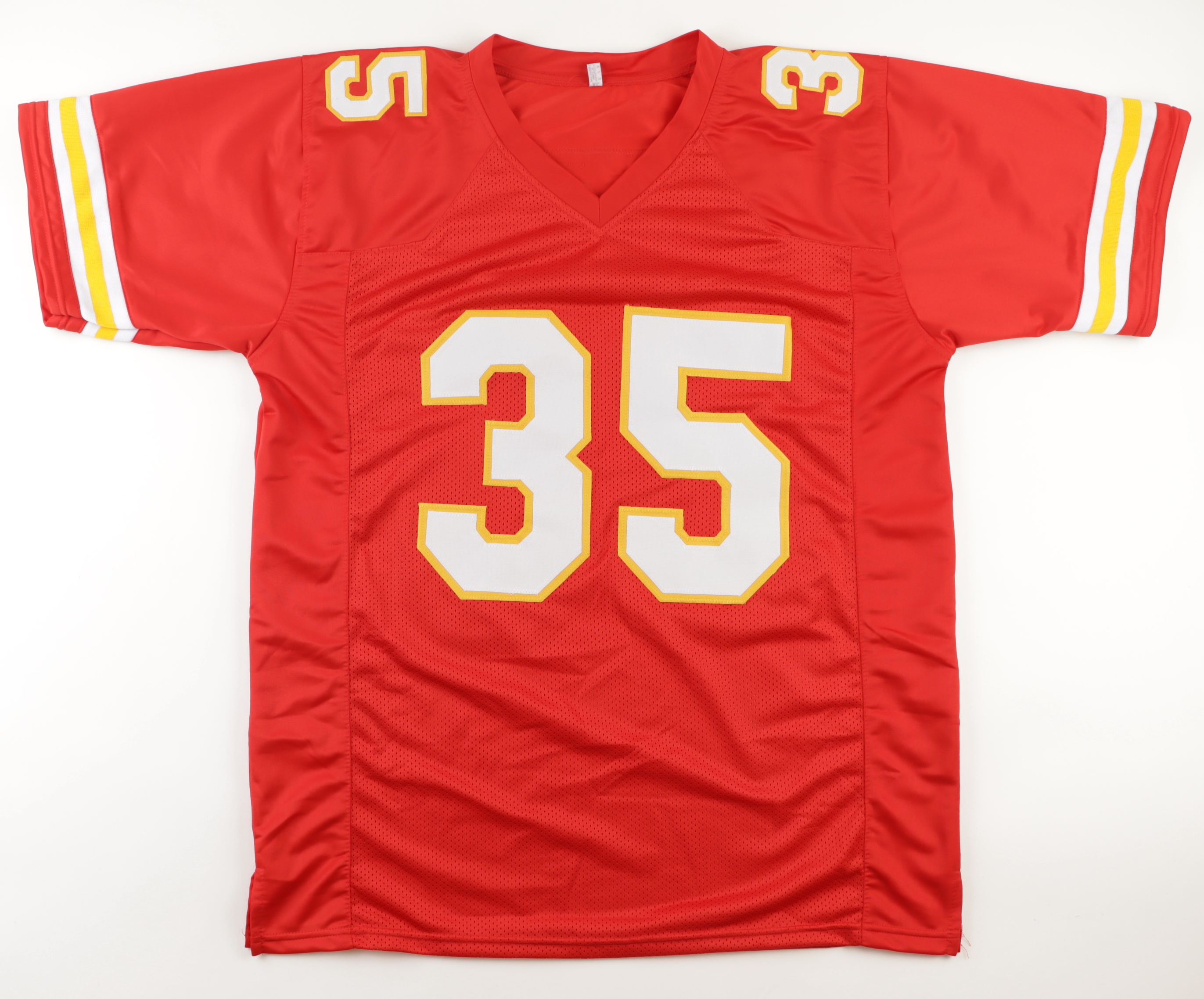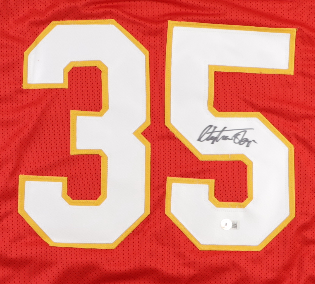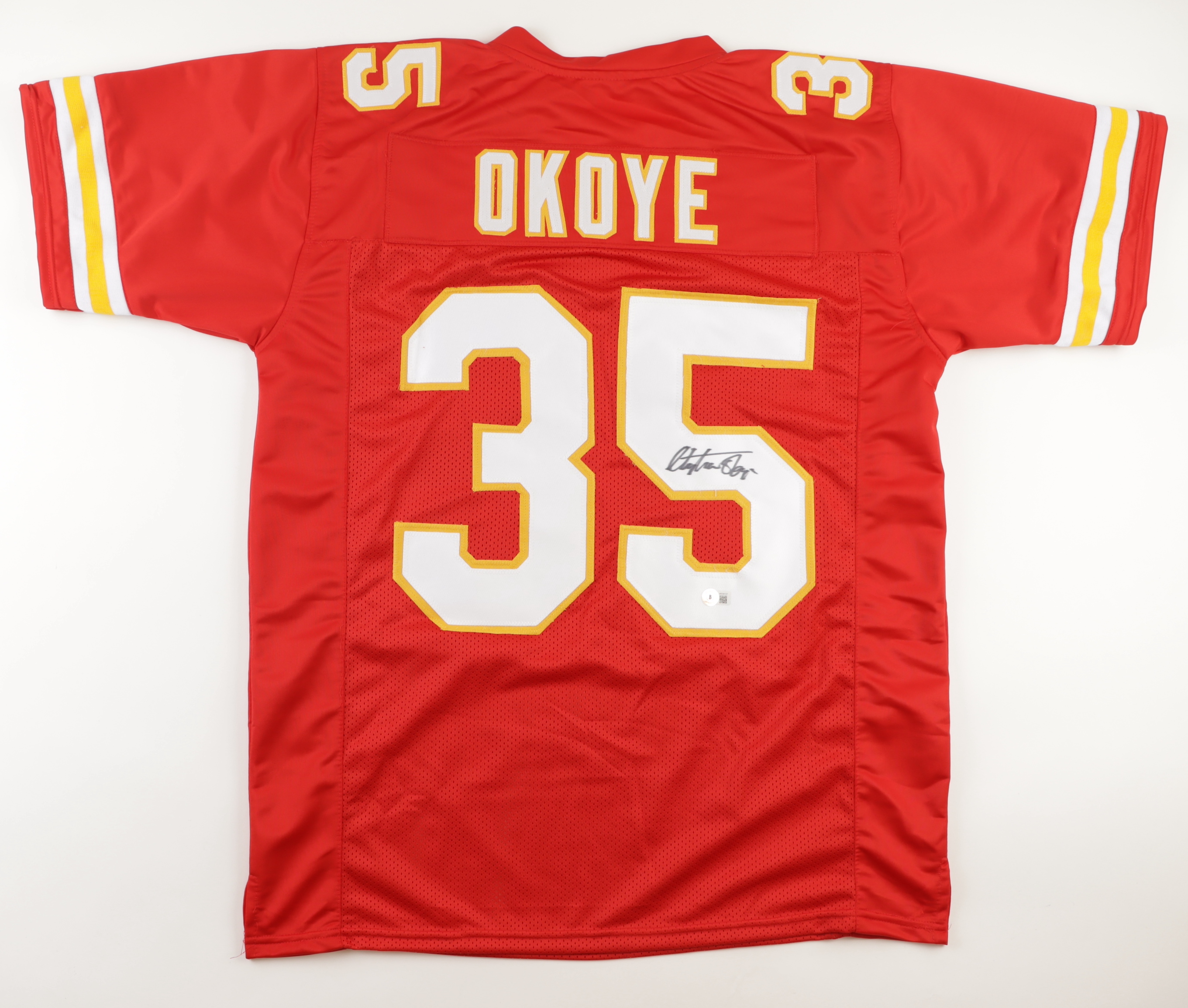 Custom jersey. Everything sewn on, size XL. Hand-signed by Christian Okoye.
