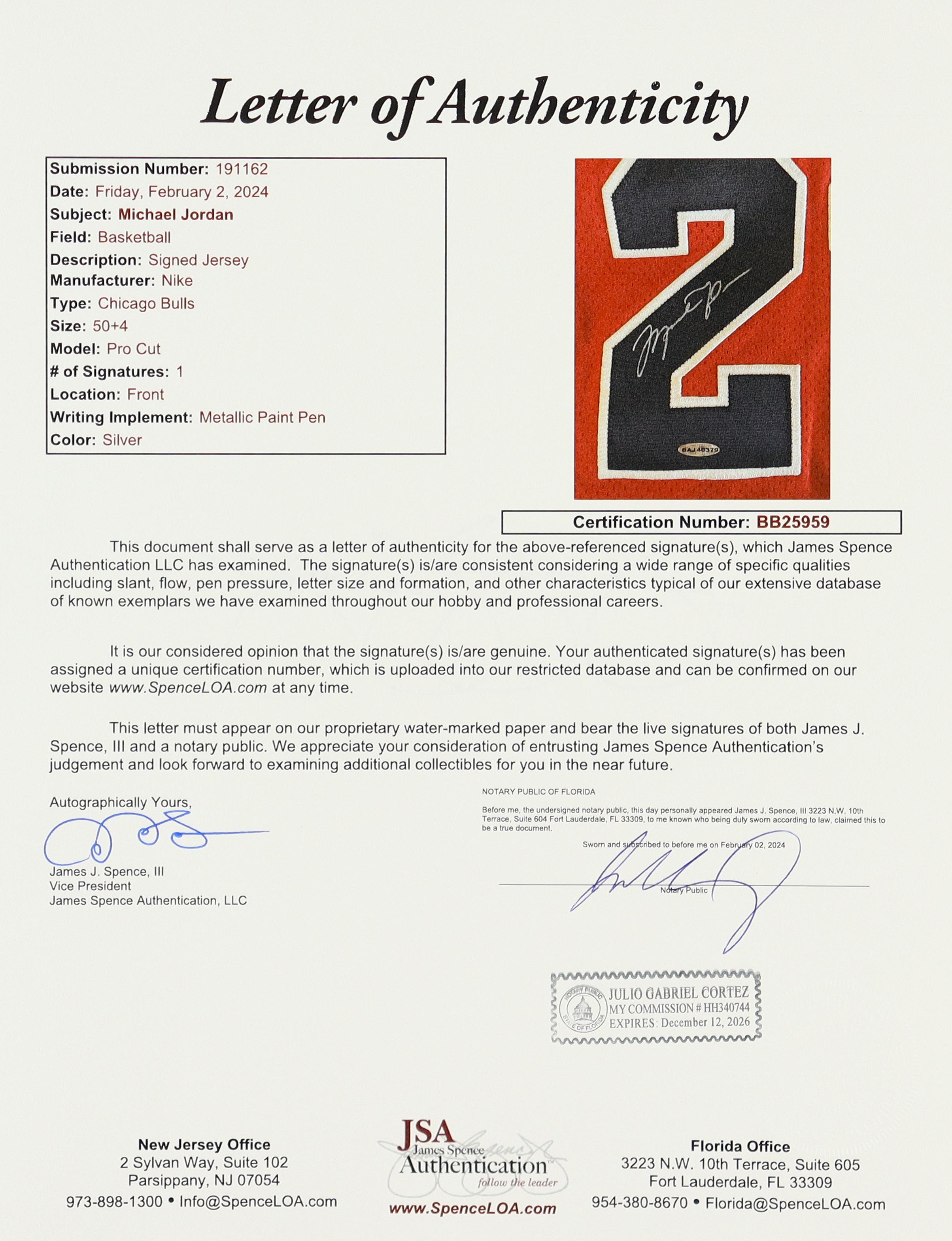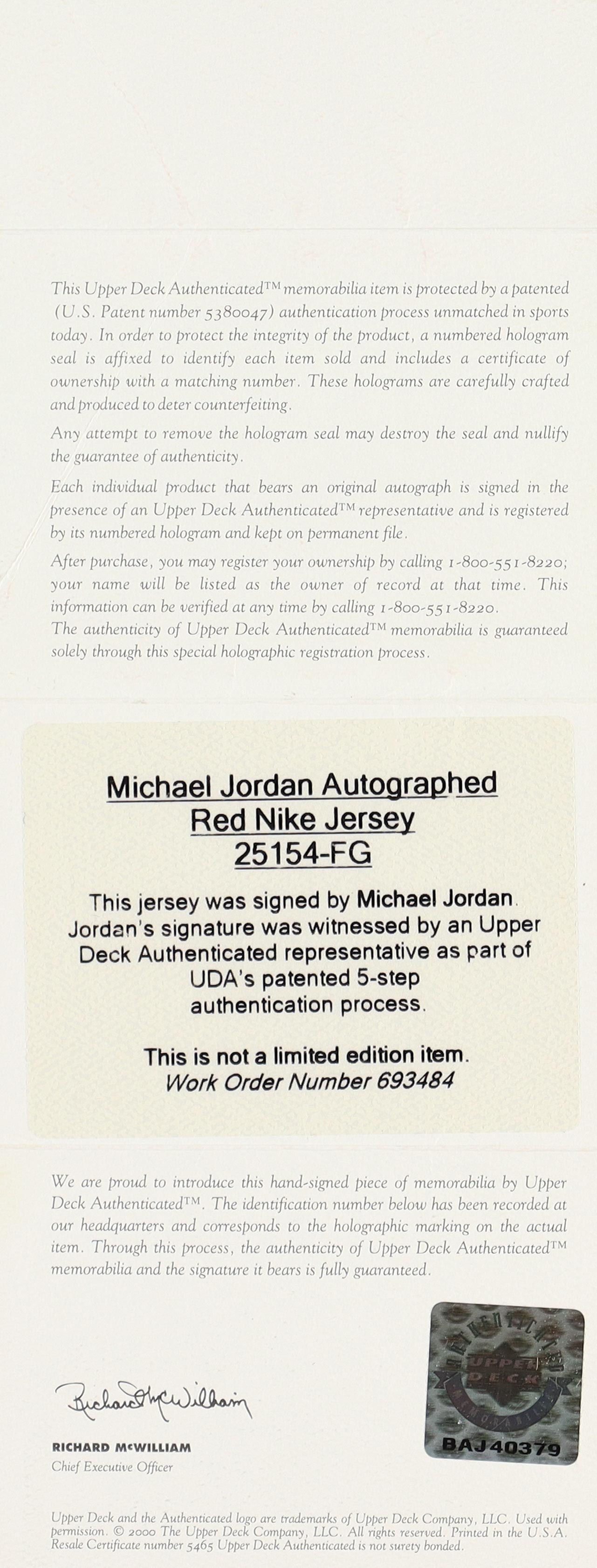 Nike Pro Cut authentic jersey. Everything is sewn on, size 50 +4 Length. Hand-signed by Michael Jordan (Chicago Bulls, HOF).