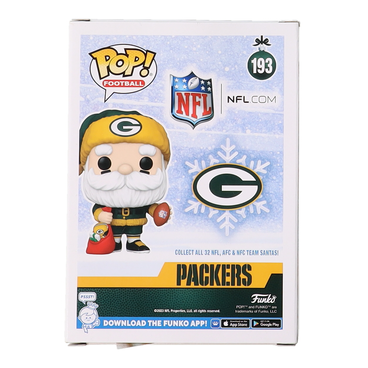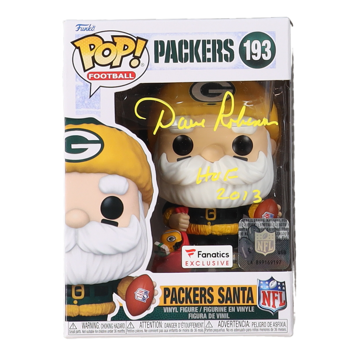 Funko Pop! vinyl figure measures approximately 4" tall. Hand-signed and inscribed on the packaging by Dave Robinson (Green Bay Packers).