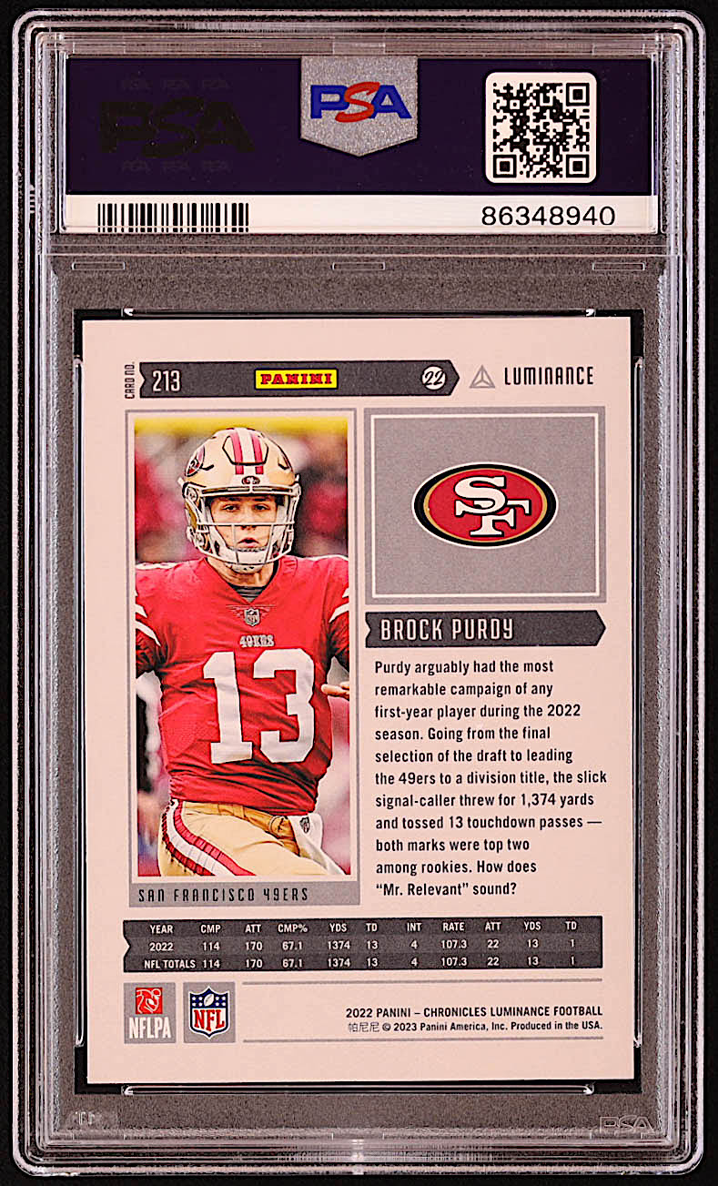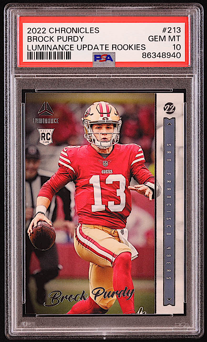 Brock Purdy 2022 Panini Chronicles Luminance Update Vertical Rookies #213 RC (PSA 10)