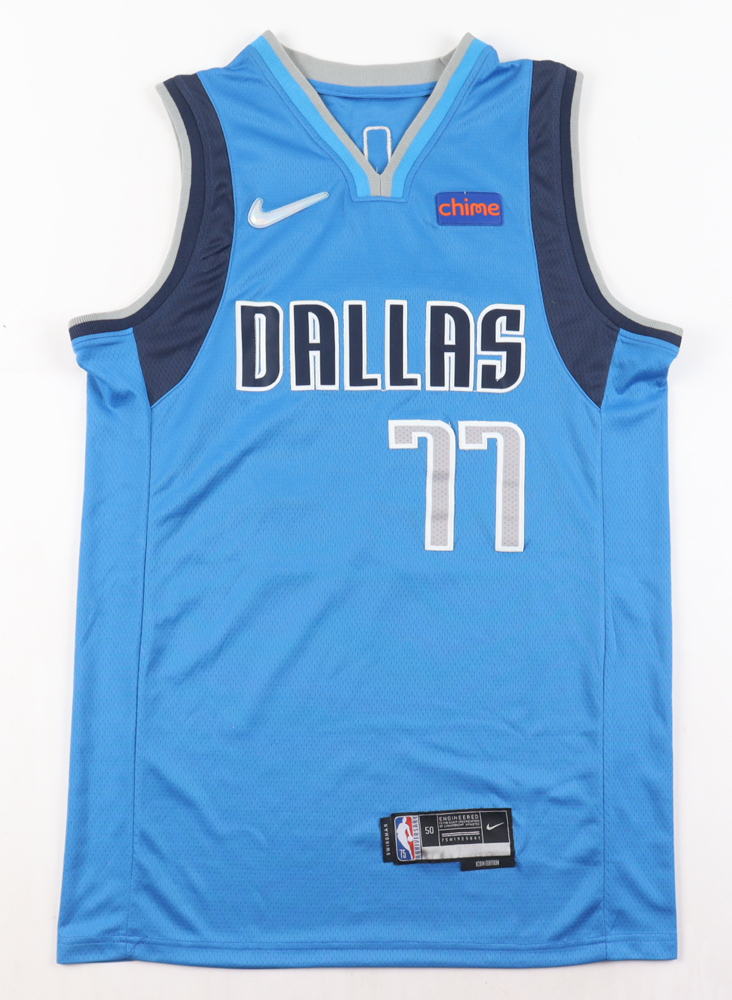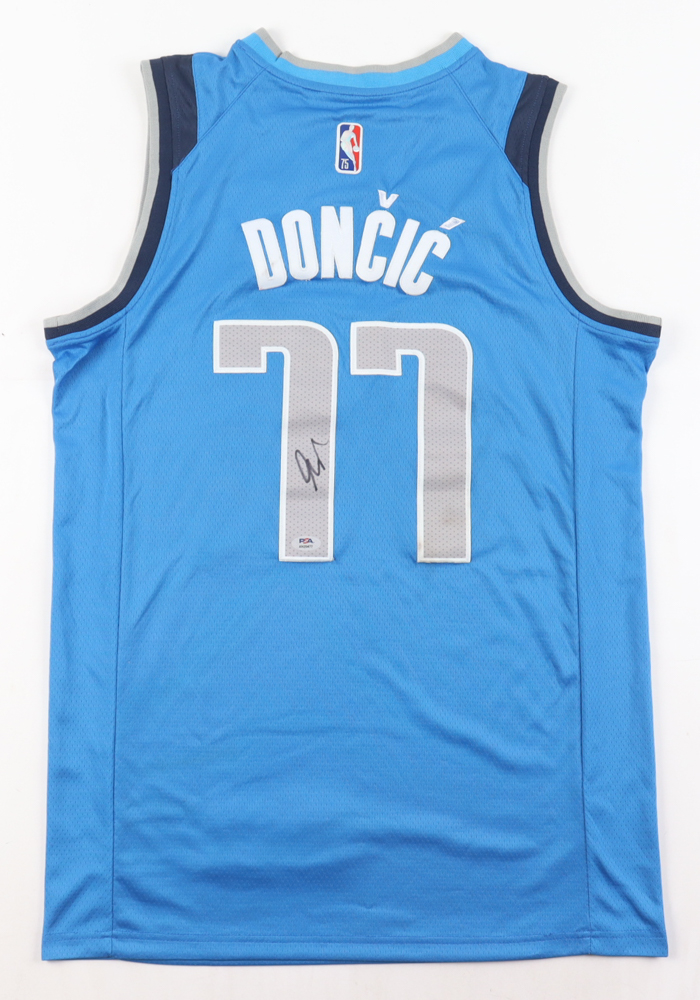 Nike jersey with everything sewn on, size 50. Hand-signed by Luka Doncic. Please note, there are stains on the reverse number and players names.