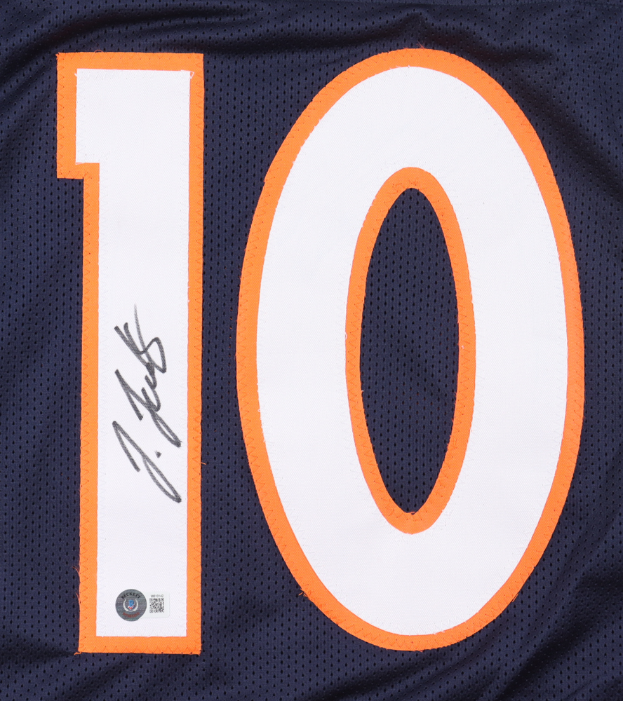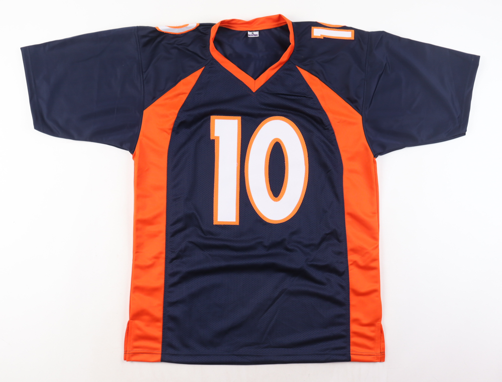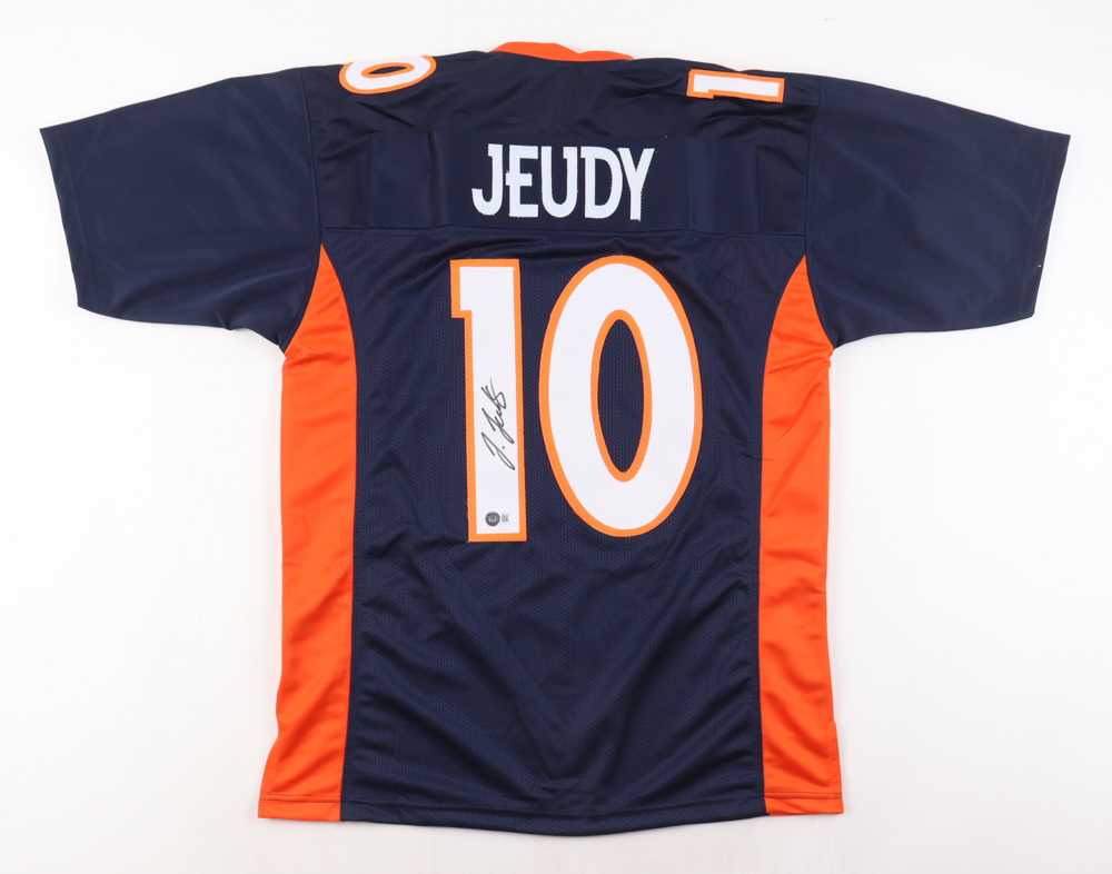 Custom jersey. Everything is sewn on, size XL. Hand-signed by Jerry Jeudy. Please note, glue is visible through the reverse number.