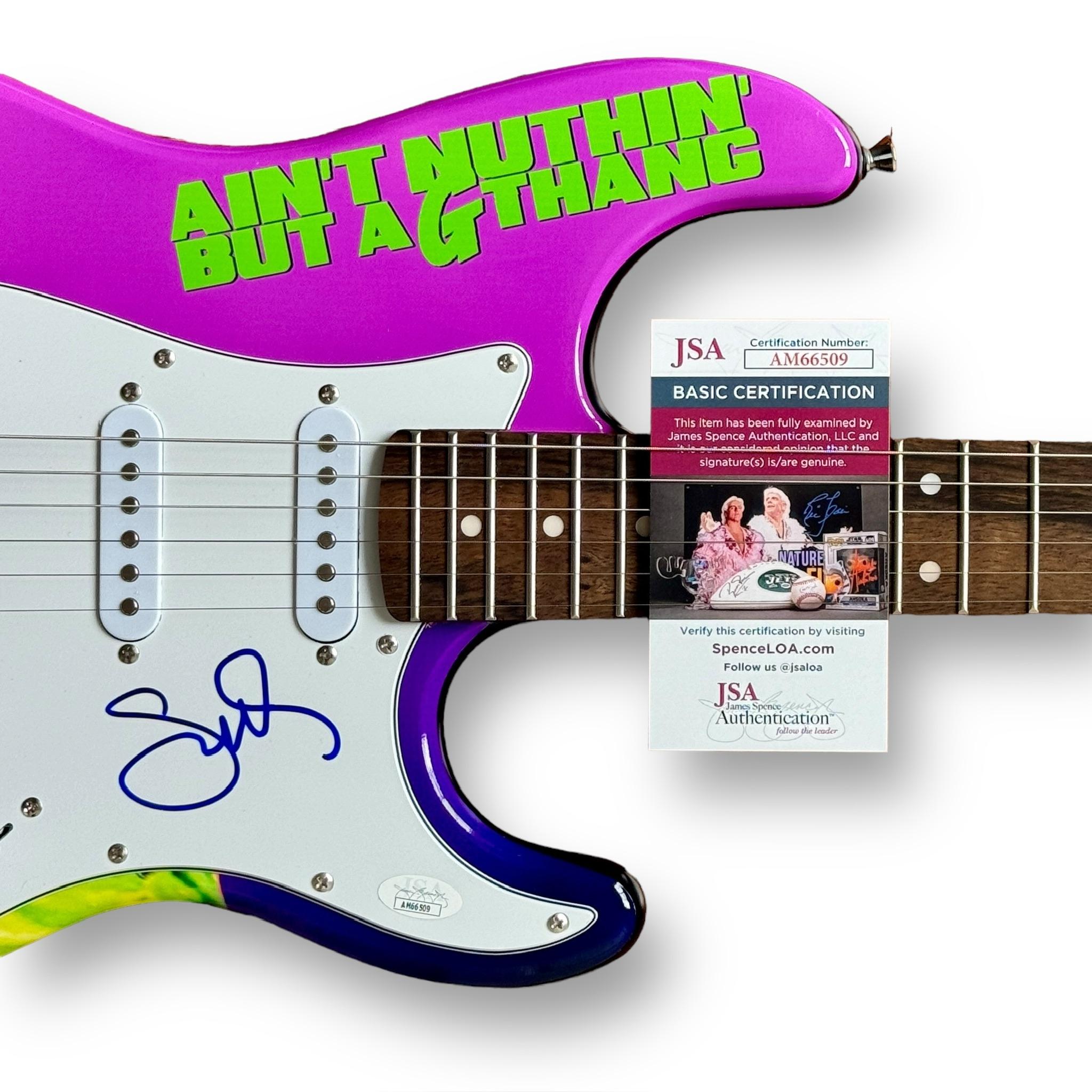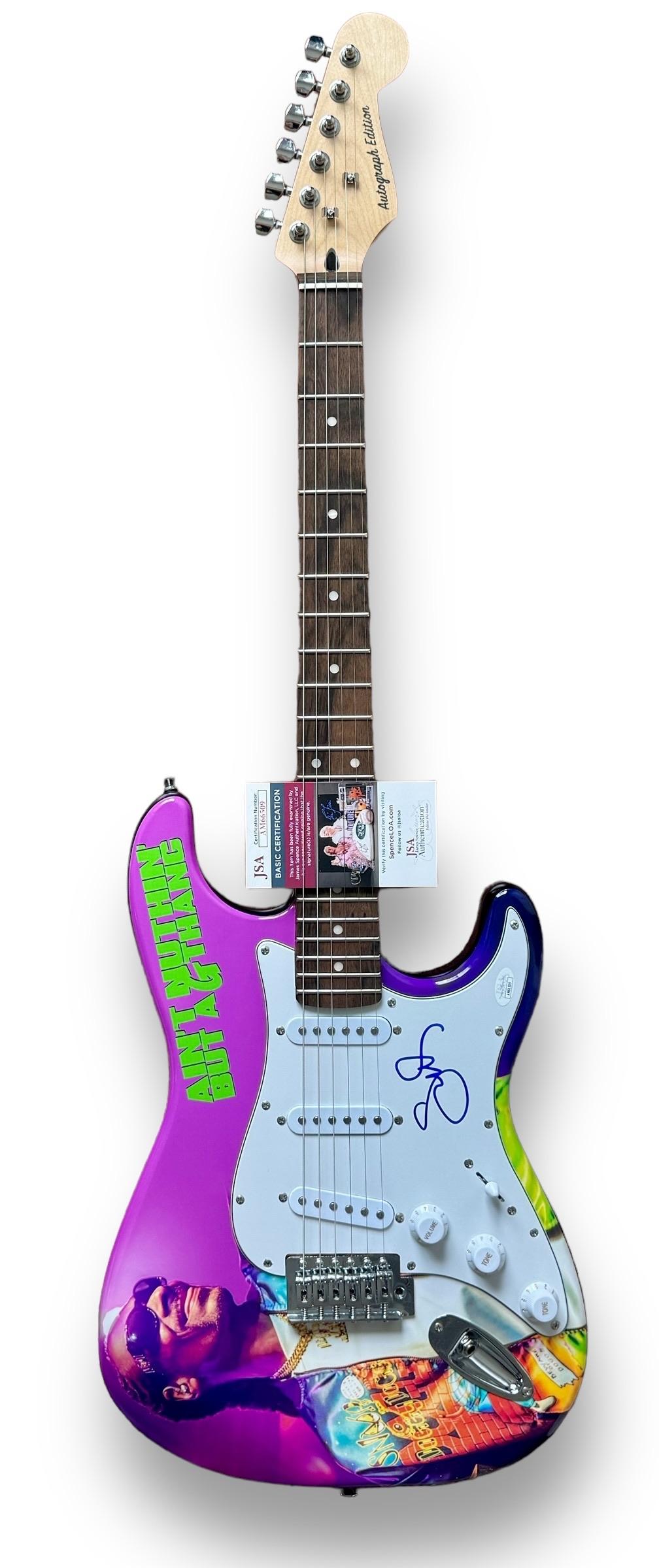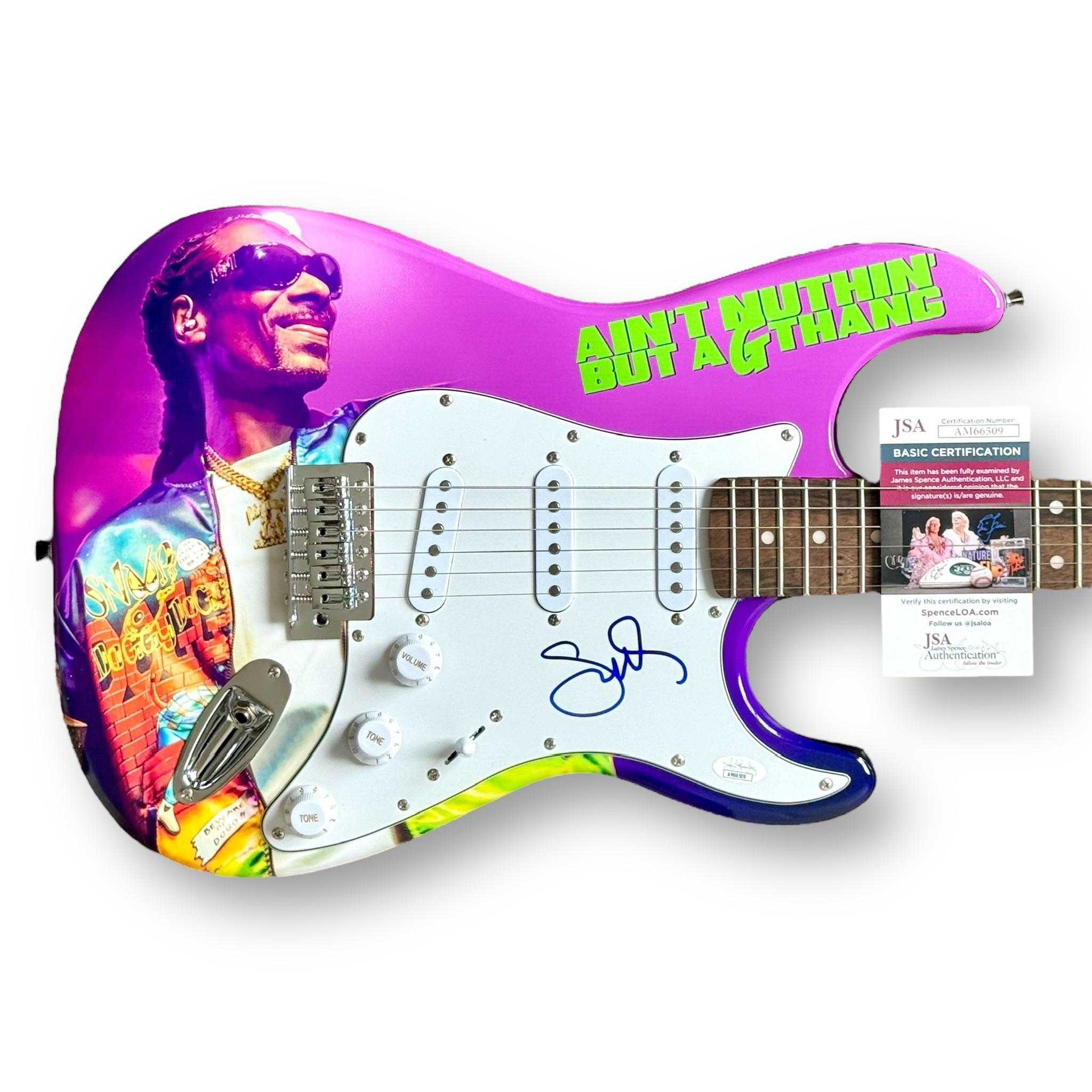Custom Stratocaster style electric guitar measures approximately 39" in length and has been hand-signed on the pickguard by Snoop Dogg.