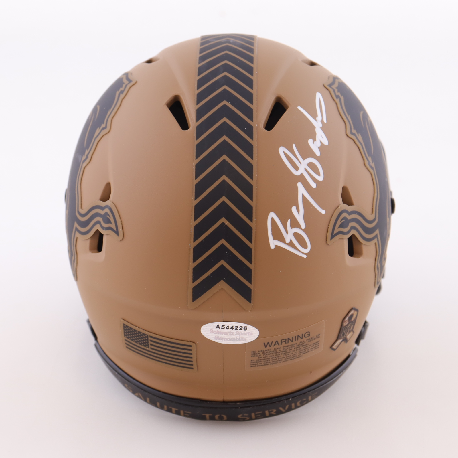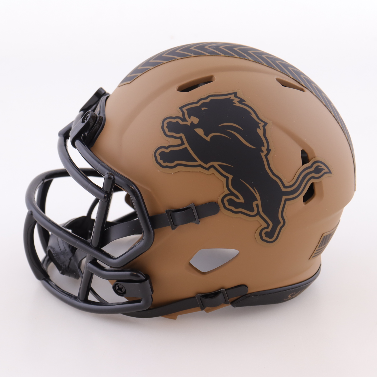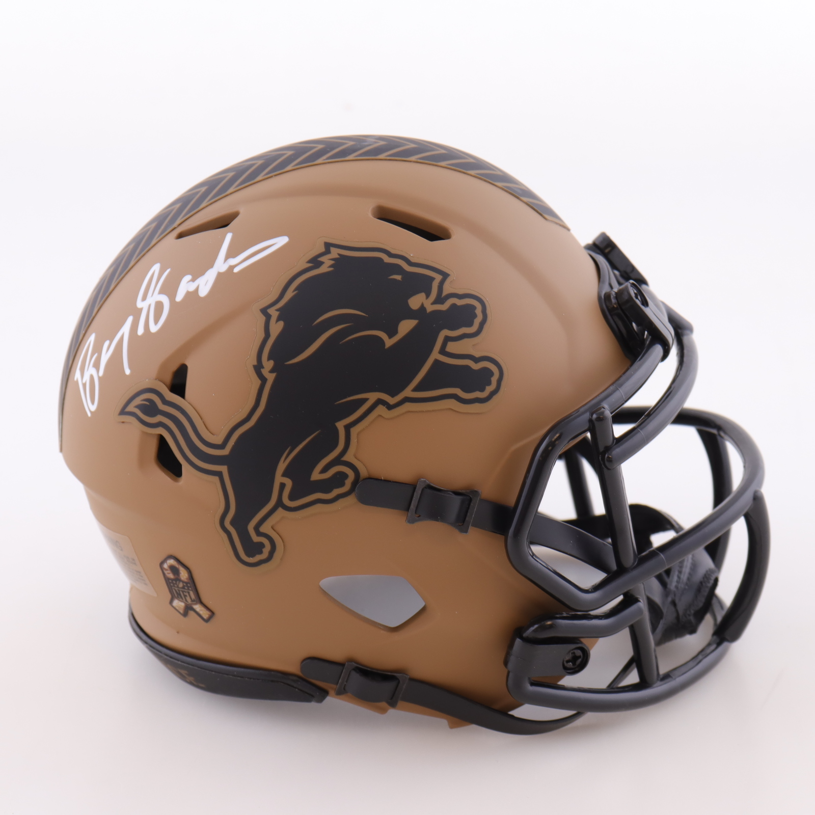 Riddell Detroit Lions Salute to Service Alternate Speed mini helmet. Hand-signed by Barry Sanders (HOF).
