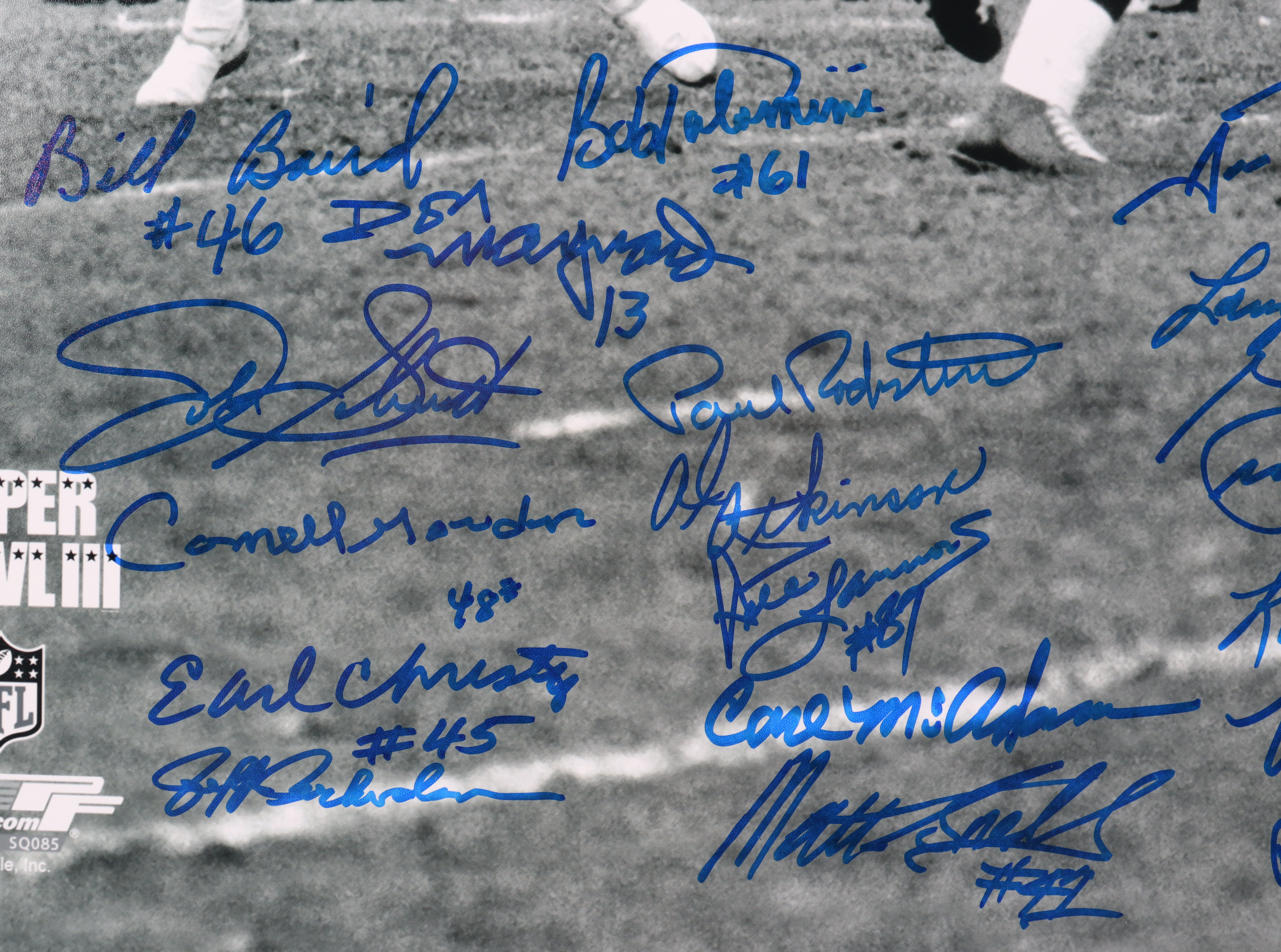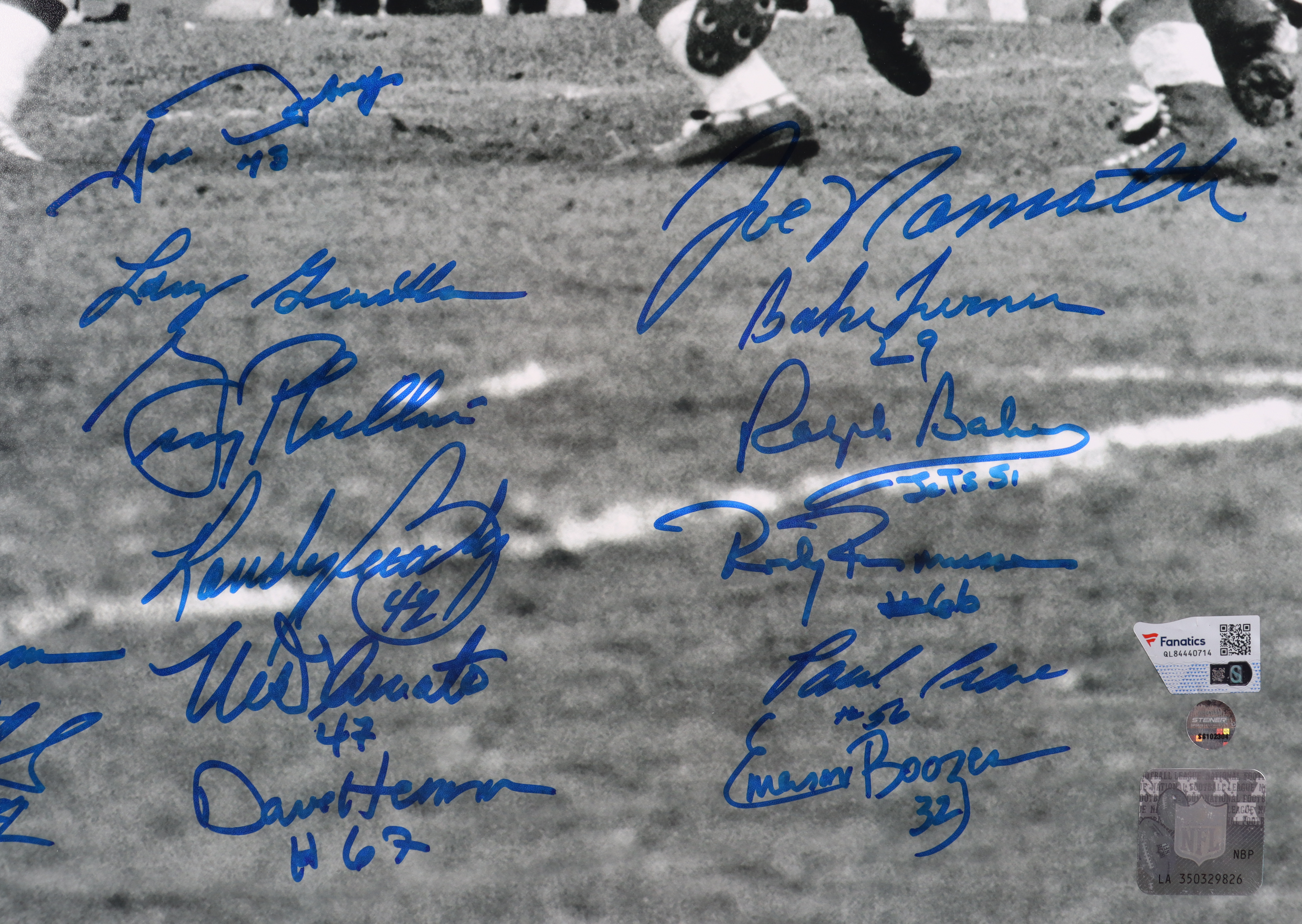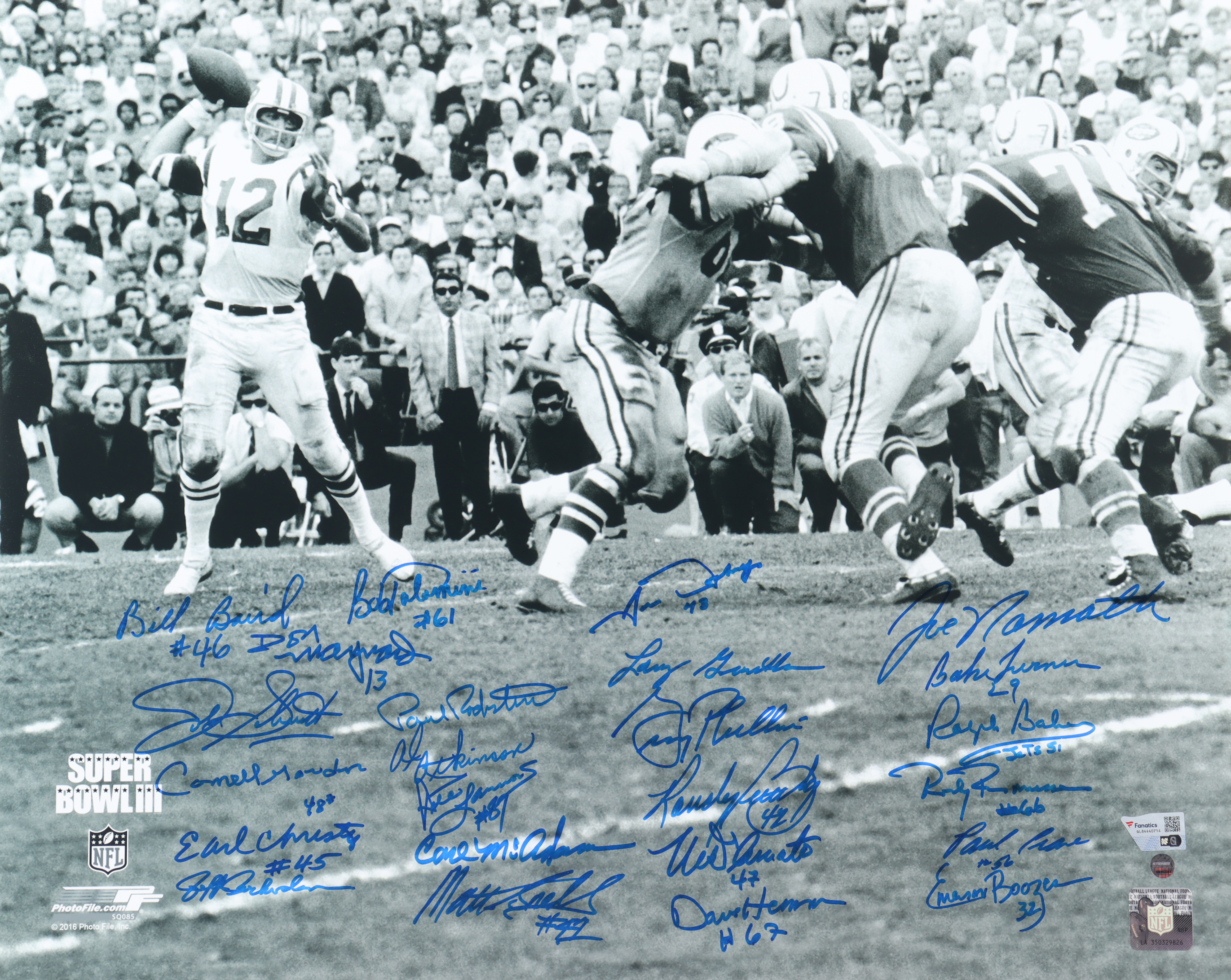 Photo measures 16" x 20" in size. Hand-signed by Joe Namath, Don Maynard, Bake Turner, Pete Lammons, Dave Herman, John Schmidt, Bob Talamini, Gerry Philbin, Paul Rochester, Randy Rasmussen, Ralph Baker, Larry Grantham, Bill Baird, Carl McAdams, Al Atkinson, Cornell Gordon, Randy Beverly, John Dockery, Earl Christy, Paul Crane, Jeff Richardson, Mike D'Amato, Emerson Boozer and Matt Snell.
