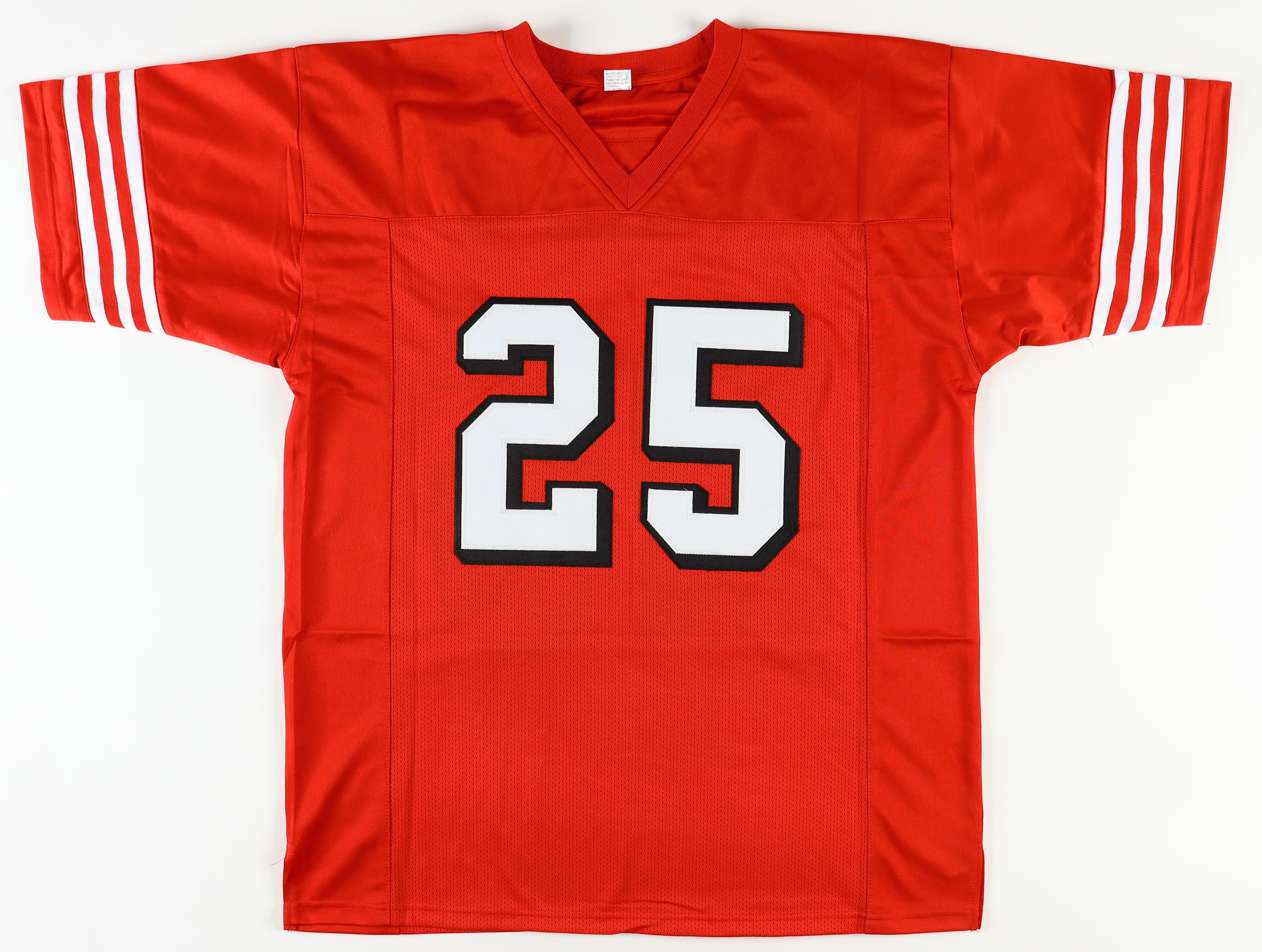 Custom jersey. Everything is sewn on, size XL. Hand-signed by Elijah Mitchell.