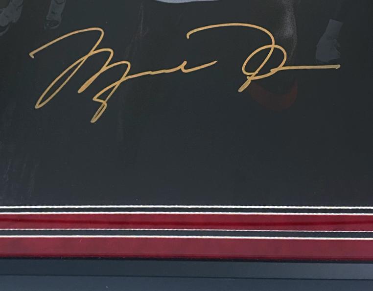 Custom frame measures 37" x 47" in size and features a photo that has been hand-signed by Michael Jordan (Chicago Bulls, HOF). This item is limited edition and has been numbered #24/98.