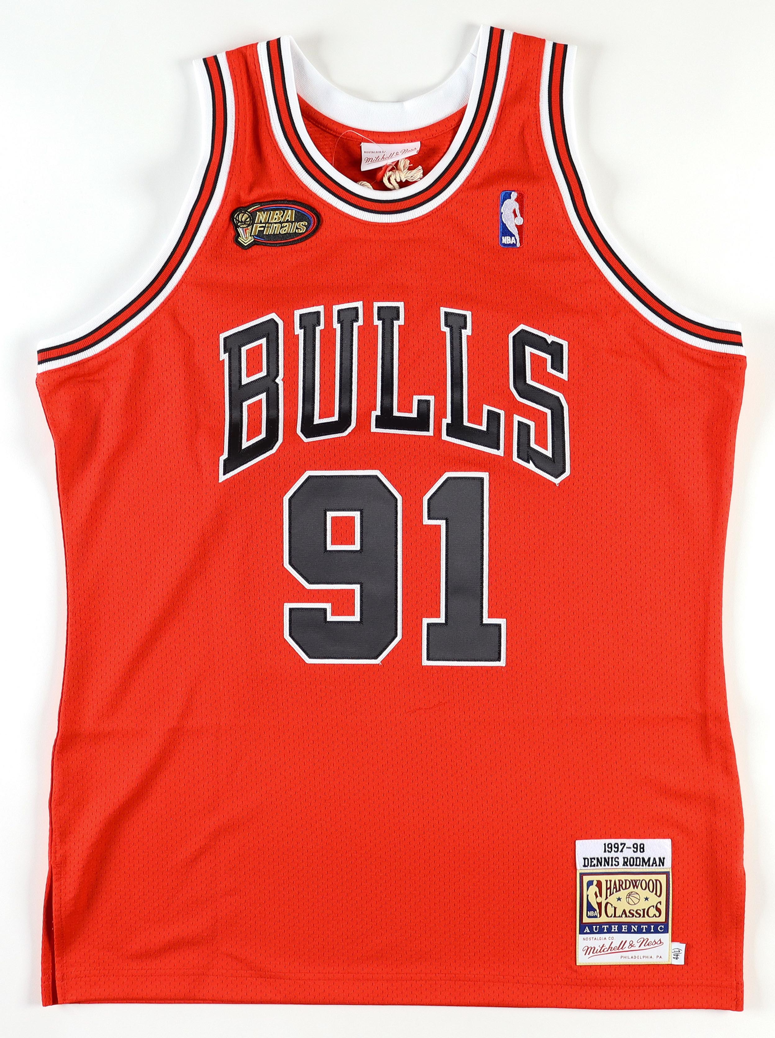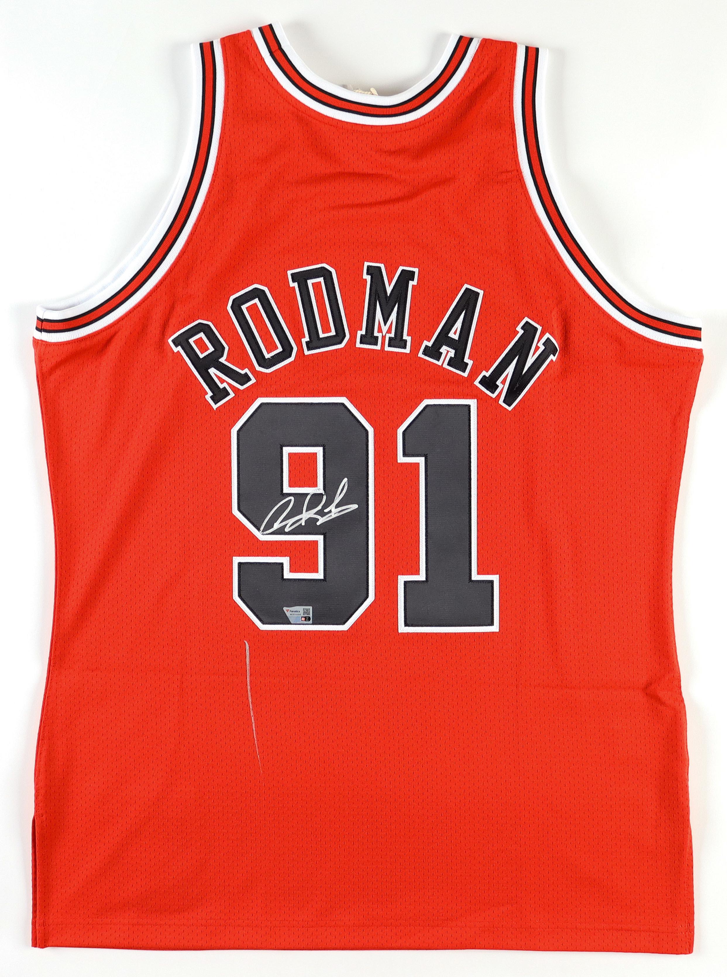 Mitchell & Ness jersey. Everything is sewn on, size XL. Hand-signed by Dennis Rodman (Chicago Bulls, HOF). Please note, there is a stray pen mark below the signed number.