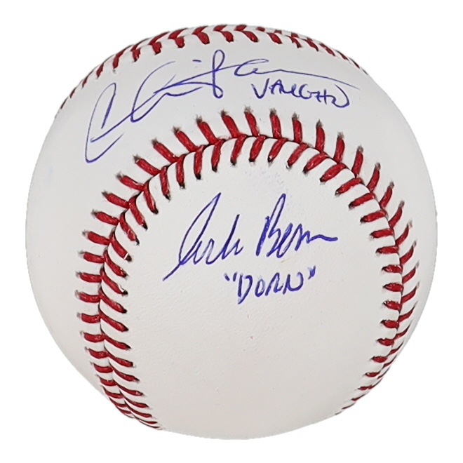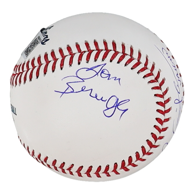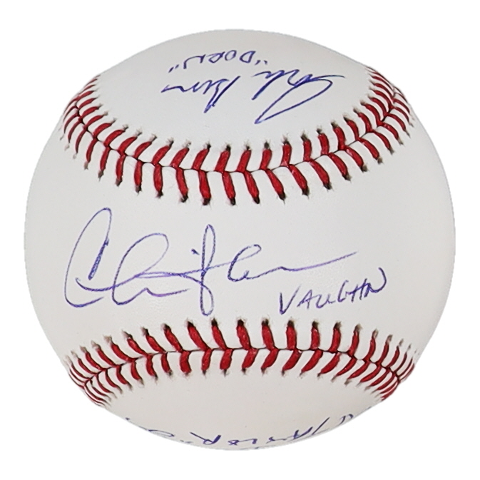Rawlings Official Major League Baseball. Hand-signed and inscribed by Charlie Sheen (Ricky Vaughn), Tom Berringer (Jake Taylor) and Corbin Bernsen (Roger Dorn).