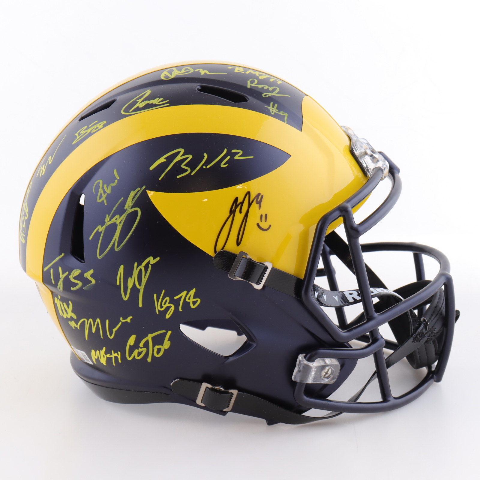 Riddell Michigan Wolverines full-size replica Speed helmet. Team-signed by (19) members of the 2023 Michigan Wolverines National Championship team. Autographs include J.J. McCarthy, Mike Barrett, Max Bredeson, Junior Colson, Blake Corum, Mason Graham, Kenneth Grant, Benjamin Hall, Jaylen Harrell, Kris Jenkins, Cornelius Johnson, Will Johnson, Trente Jones, Colston Loveland, Braiden McGregor, Rod Moore, Semaj Morgan, Roman Wilson and Zak Zinter.