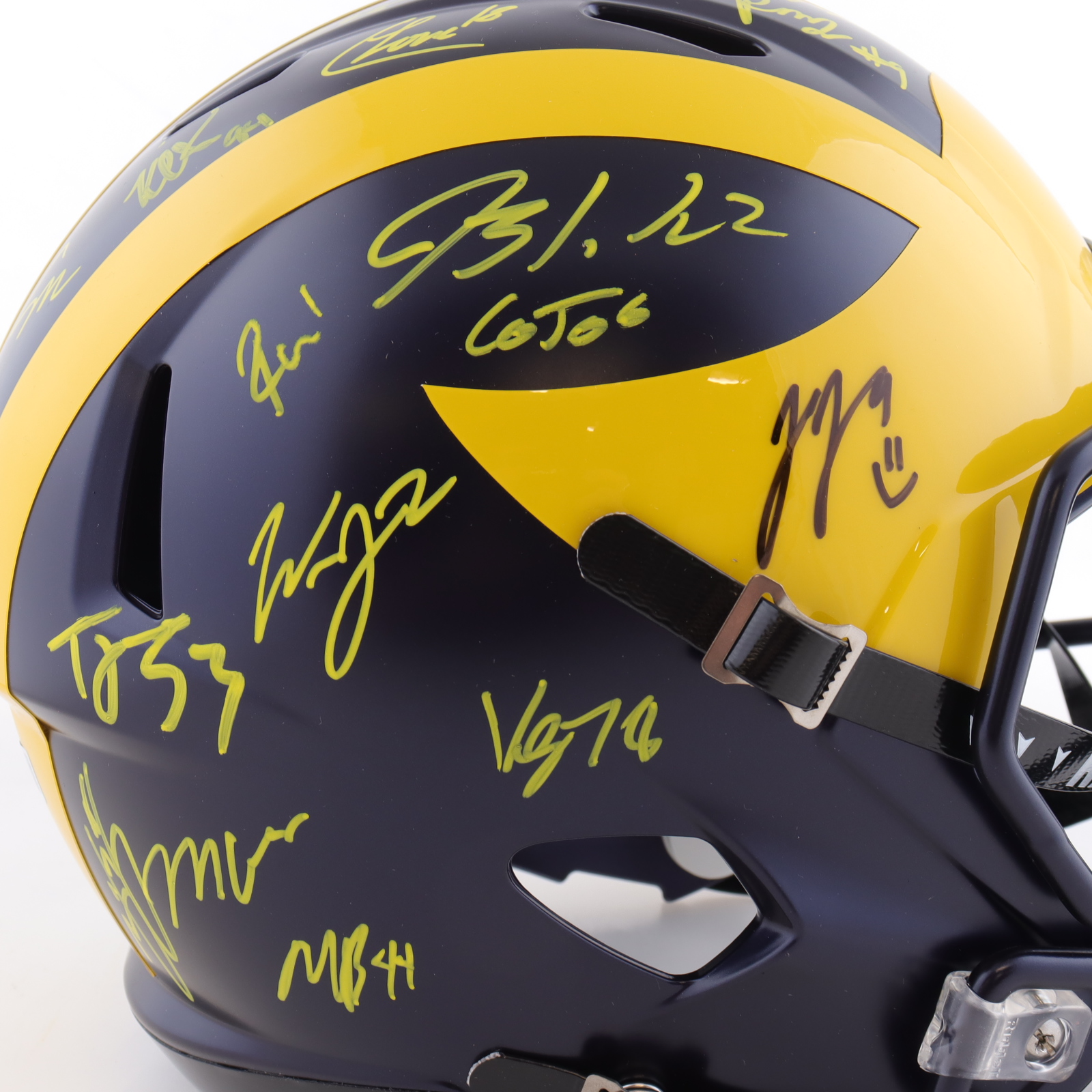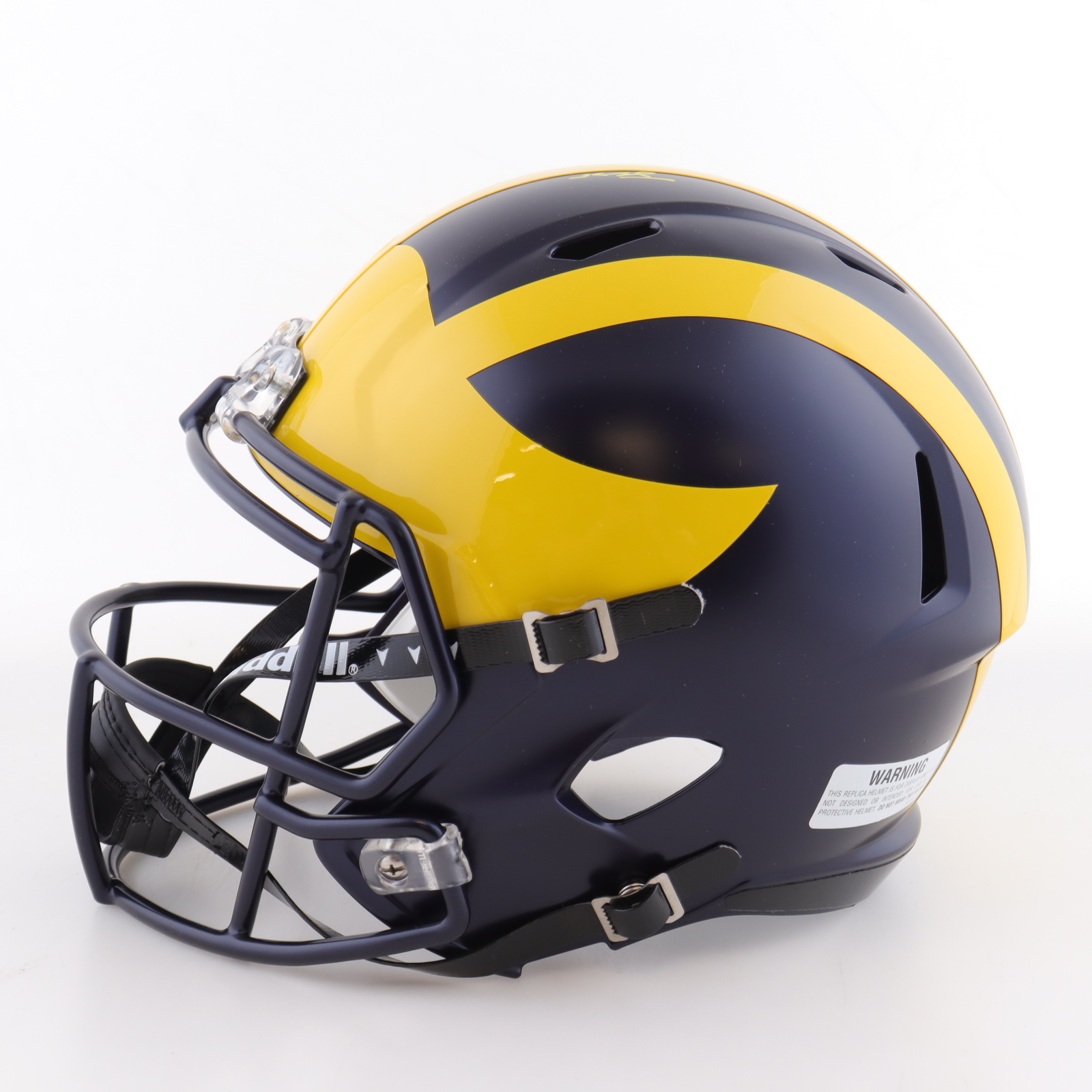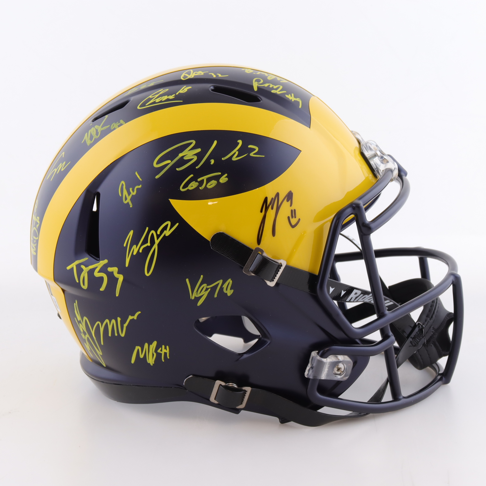 Riddell Michigan Wolverines full-size replica Speed helmet. Team-signed by (19) members of the 2023 Michigan Wolverines National Championship team. Autographs include J.J. McCarthy, Mike Barrett, Max Bredeson, Junior Colson, Blake Corum, Mason Graham, Kenneth Grant, Benjamin Hall, Jaylen Harrell, Kris Jenkins, Cornelius Johnson, Will Johnson, Trente Jones, Colston Loveland, Braiden McGregor, Rod Moore, Semaj Morgan, Roman Wilson and Zak Zinter.
