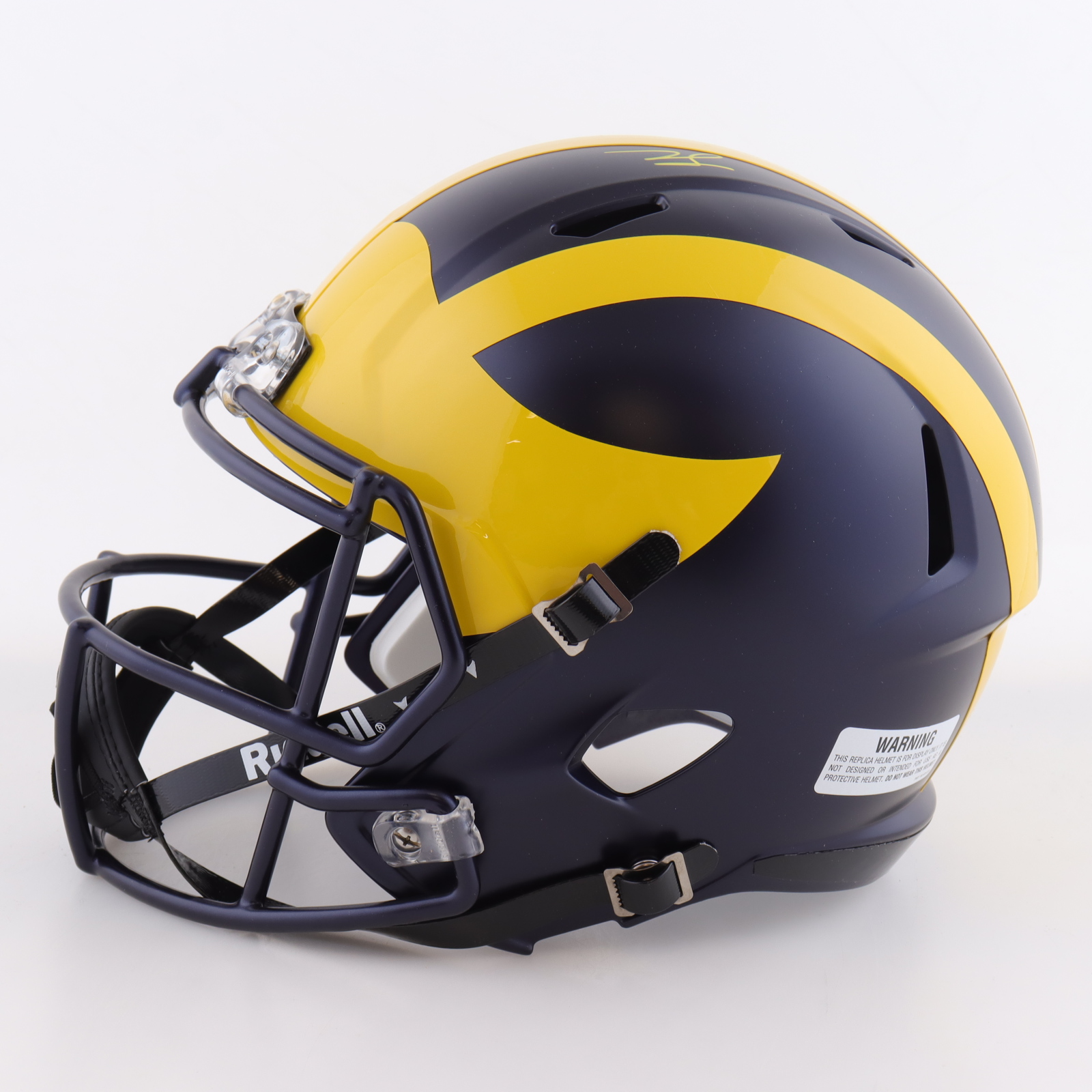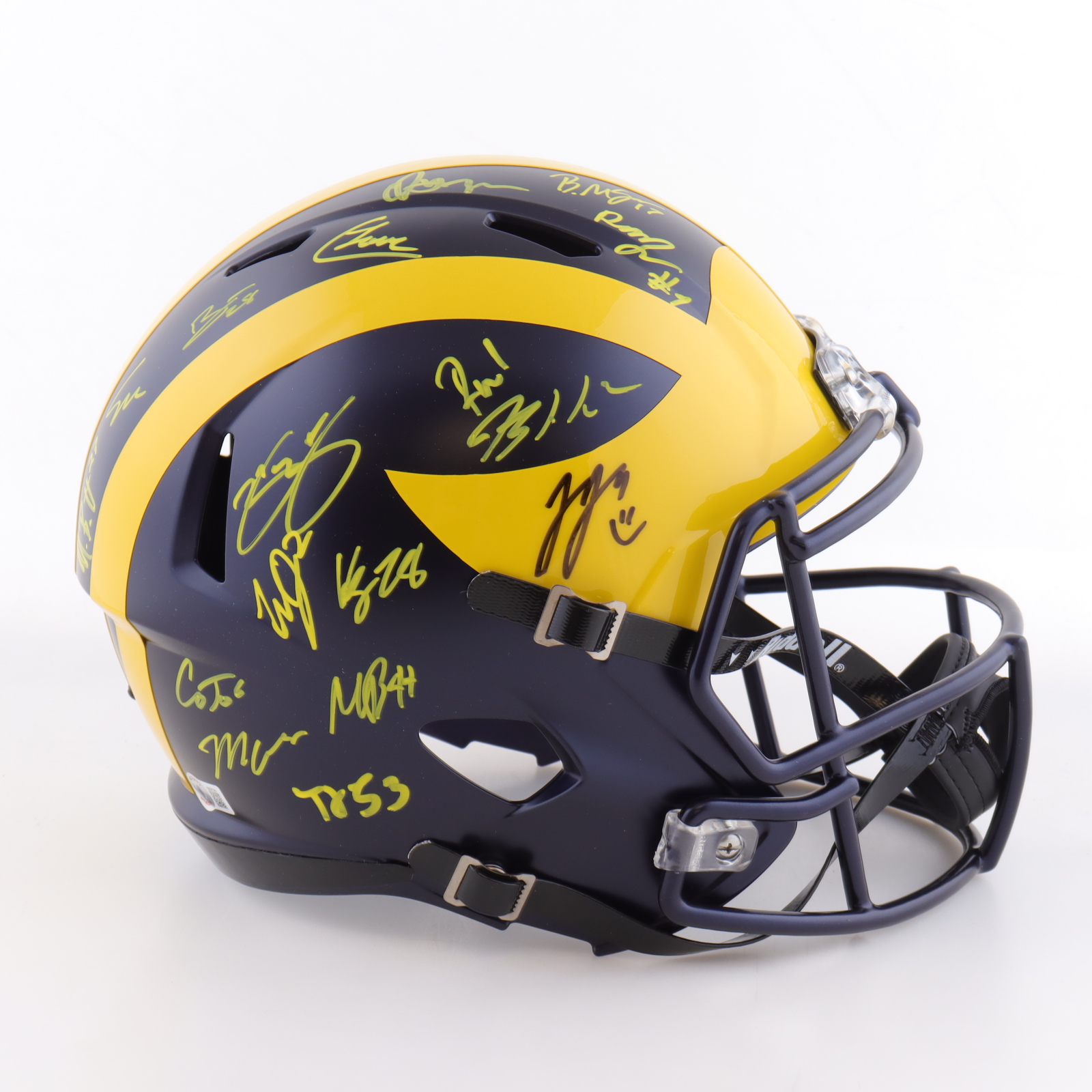 Riddell Michigan Wolverines full-size replica Speed helmet. Team-signed by (19) members of the 2023 Michigan Wolverines National Championship team. Autographs include J.J. McCarthy, Mike Barrett, Max Bredeson, Junior Colson, Blake Corum, Mason Graham, Kenneth Grant, Benjamin Hall, Jaylen Harrell, Kris Jenkins, Cornelius Johnson, Will Johnson, Trente Jones, Colston Loveland, Braiden McGregor, Rod Moore, Semaj Morgan, Roman Wilson and Zak Zinter.