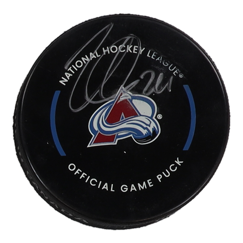 Colorado Avalanche logo hockey puck has been hand-signed by Nathan MacKinnon.