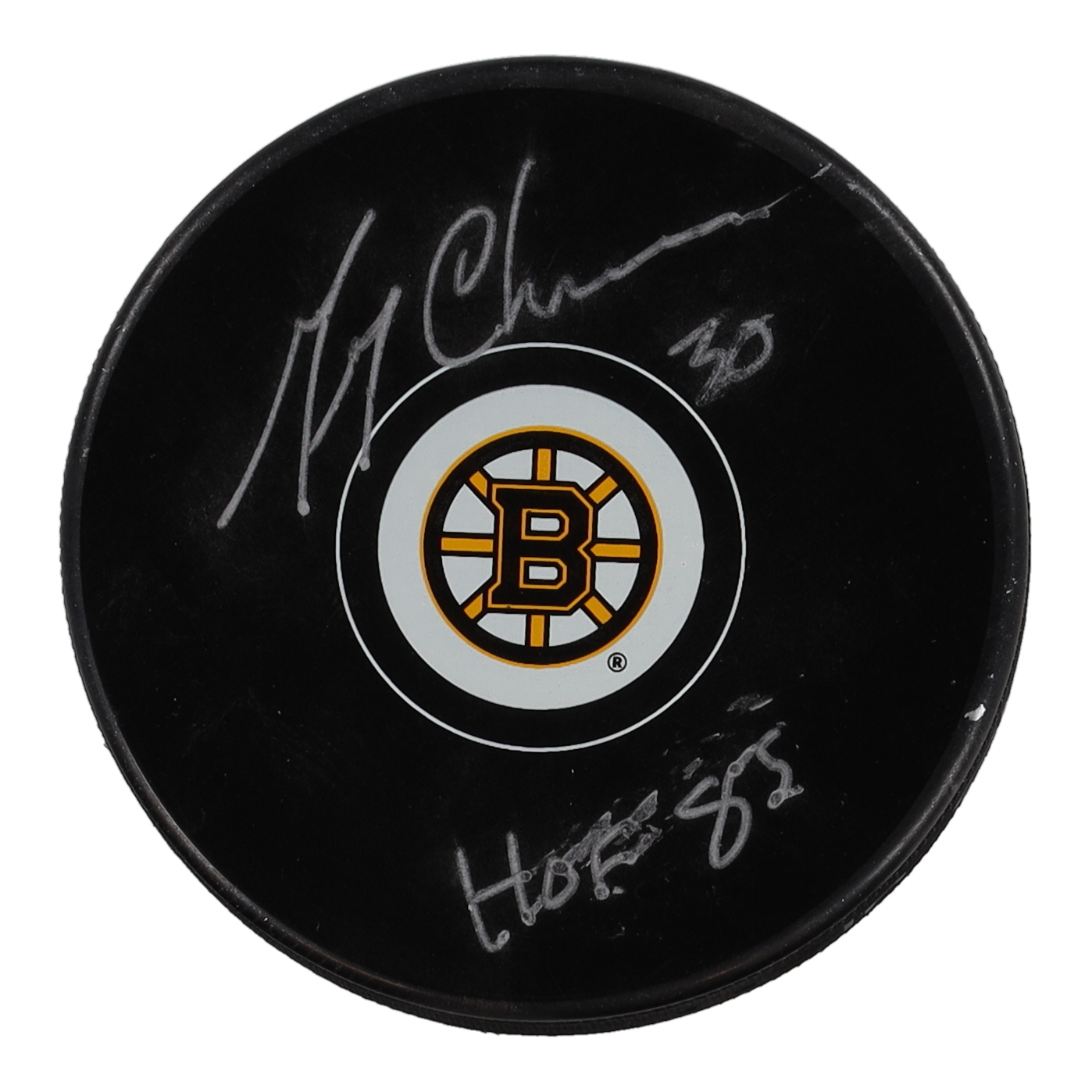 Boston Bruins logo hockey puck. Hand-signed and inscribed by Gerry Cheevers (HOF). Please note, signature has smudged.