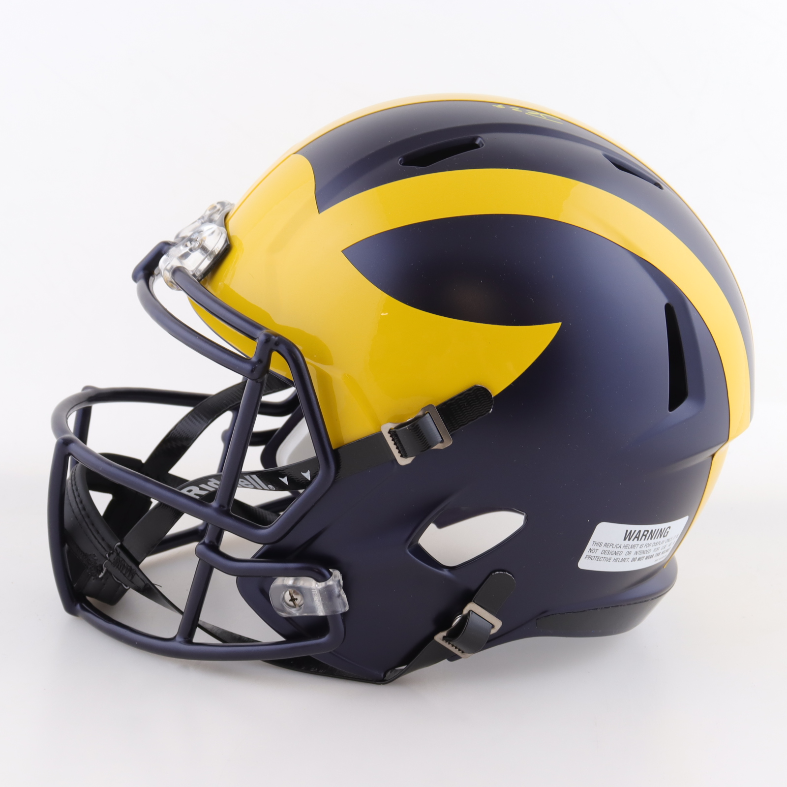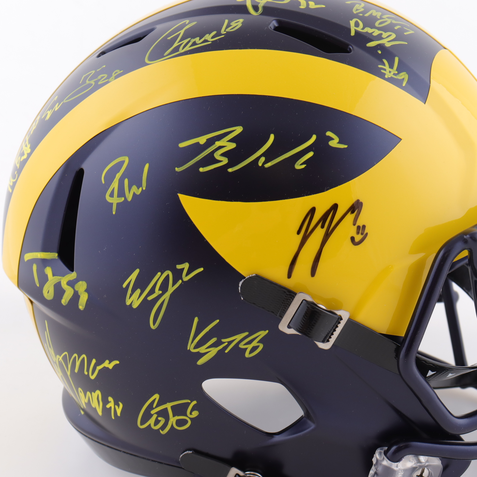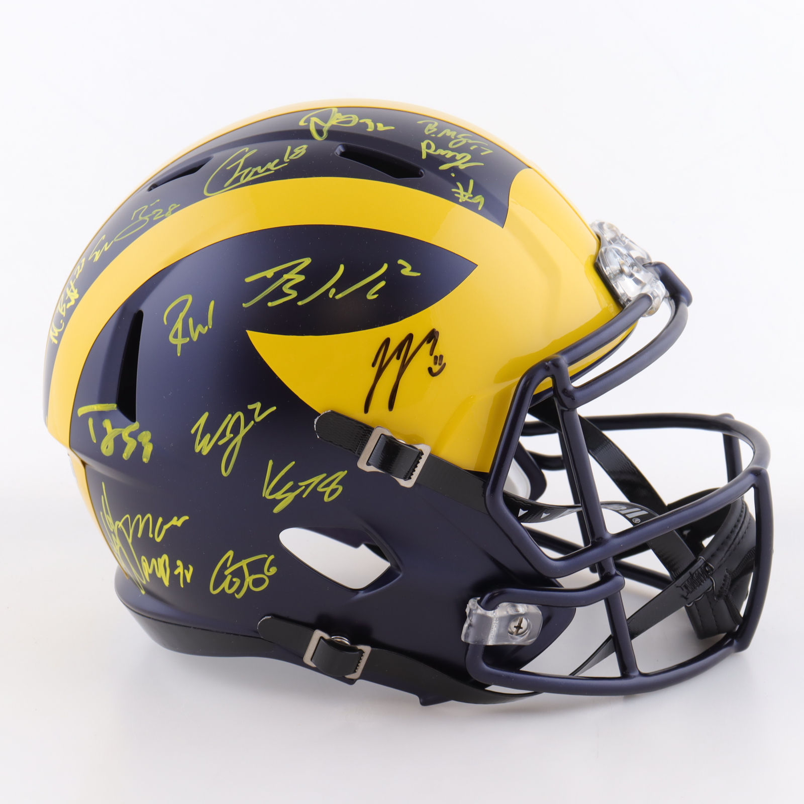 Riddell Michigan Wolverines full-size replica Speed helmet. Team-signed by (19) members of the 2023 Michigan Wolverines National Championship team. Autographs include J.J. McCarthy, Mike Barrett, Max Bredeson, Junior Colson, Blake Corum, Mason Graham, Kenneth Grant, Benjamin Hall, Jaylen Harrell, Kris Jenkins, Cornelius Johnson, Will Johnson, Trente Jones, Colston Loveland, Braiden McGregor, Rod Moore, Semaj Morgan, Roman Wilson and Zak Zinter.