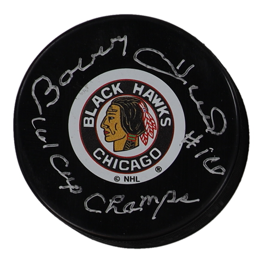 Bobby Hull Signed Blackhawks Logo Hockey Puck Inscribed "61 Cup Champs" (PSA)