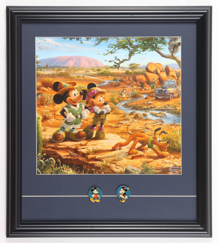 Custom frame display measures approximately 16" x 18" in size and features a print of "Mickey and Minnie on Safari" by Thomas Kinkade (D. 2012). The display also includes matching Mickey and Minnie Mouse pins. Please note, the display is unsigned.