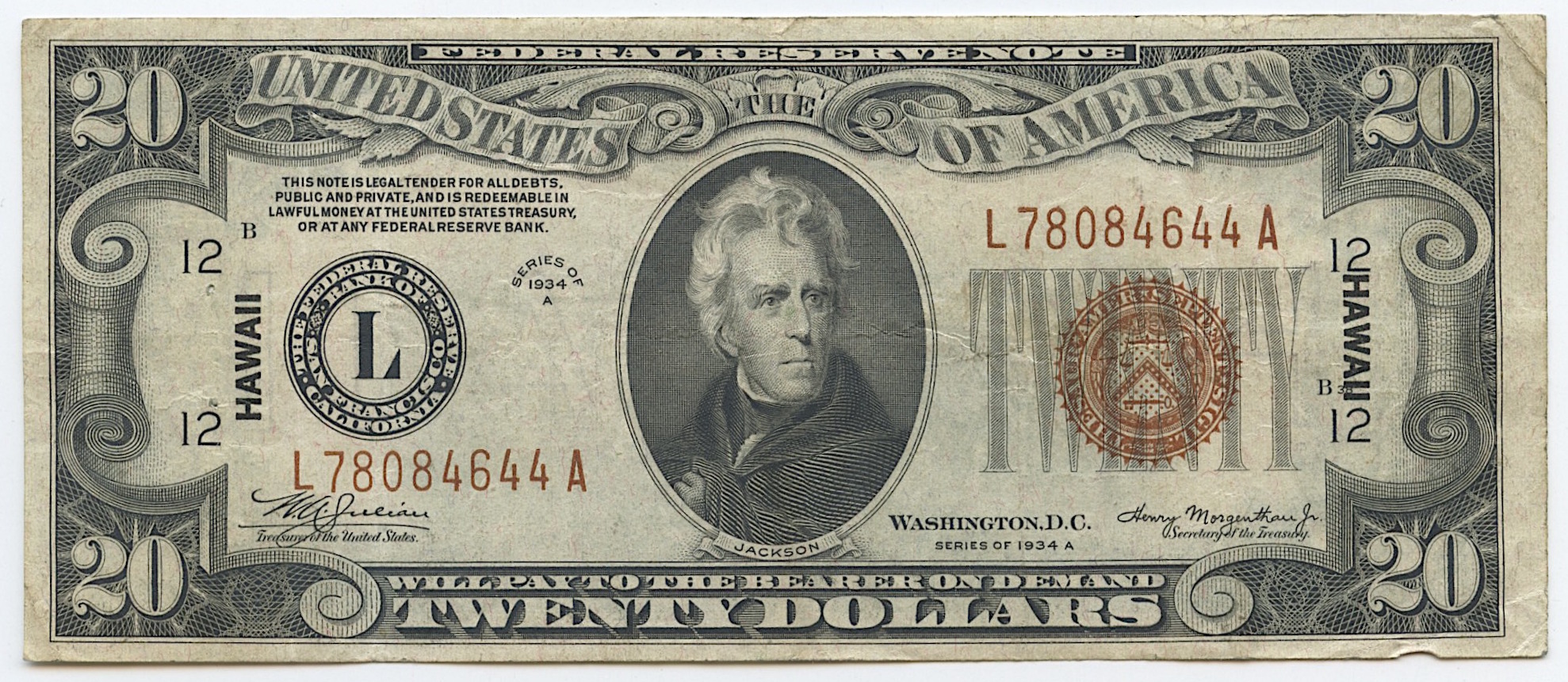 1934-A $20 Twenty Dollars Hawaii Brown Seal Federal Reserve Bank Note Bill (Fr. 2305)