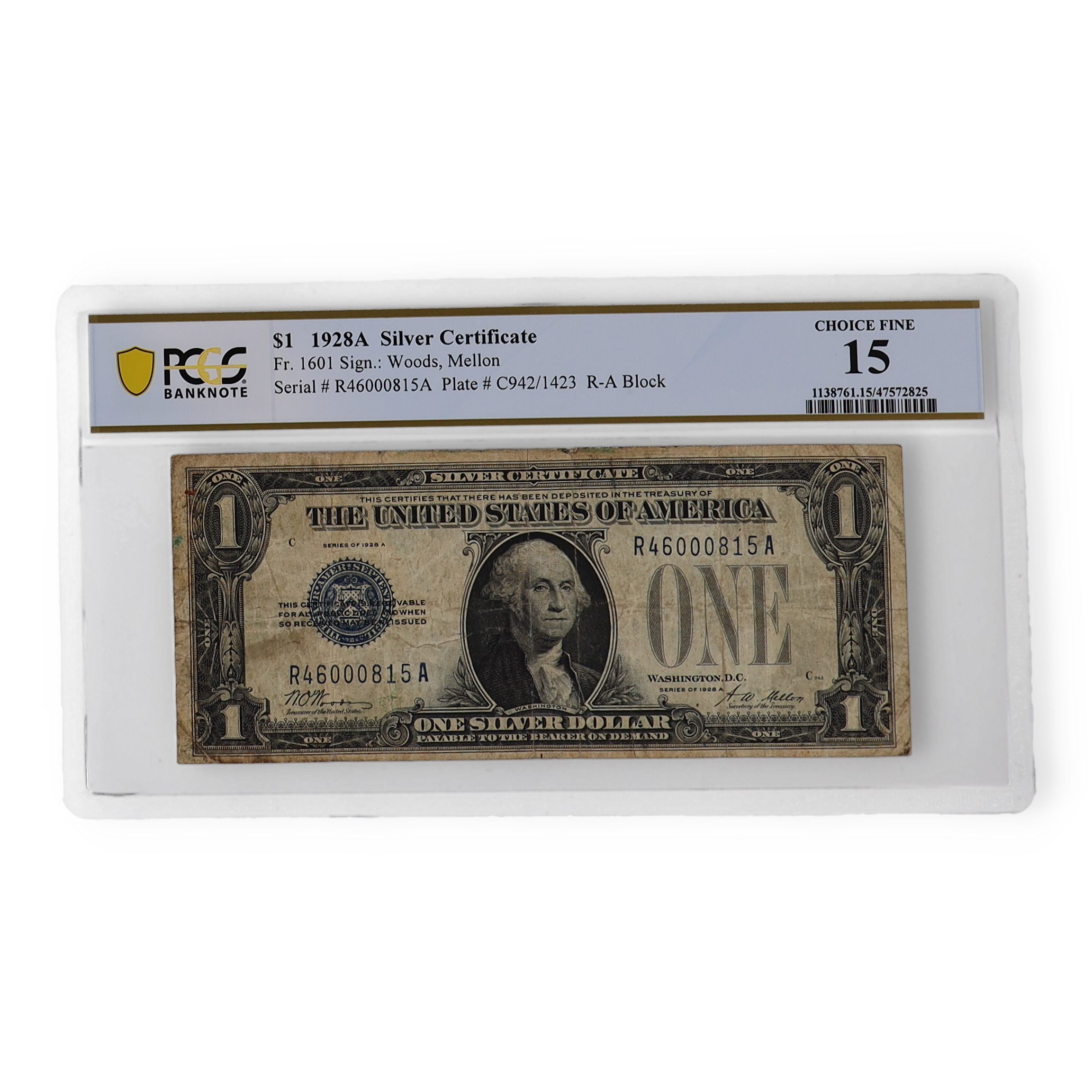 1928-A U.S. $1 One Dollar "Funny Back" Silver Certificate - Woods / Mellon (PCGS CF15)