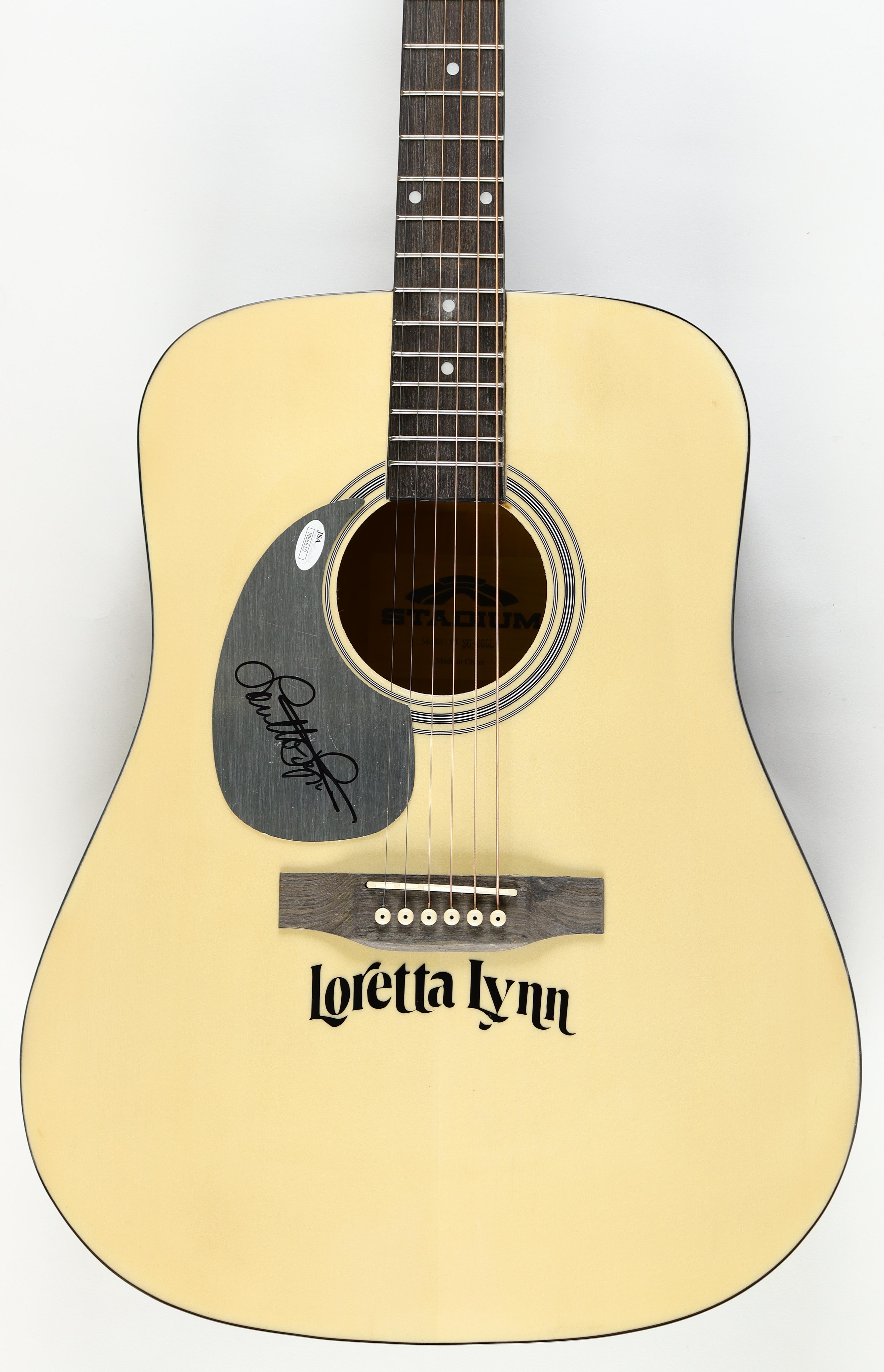Full size Stadium acoustic guitar measures 40" and has been hand-signed on the pick-guard by Loretta Lynn.