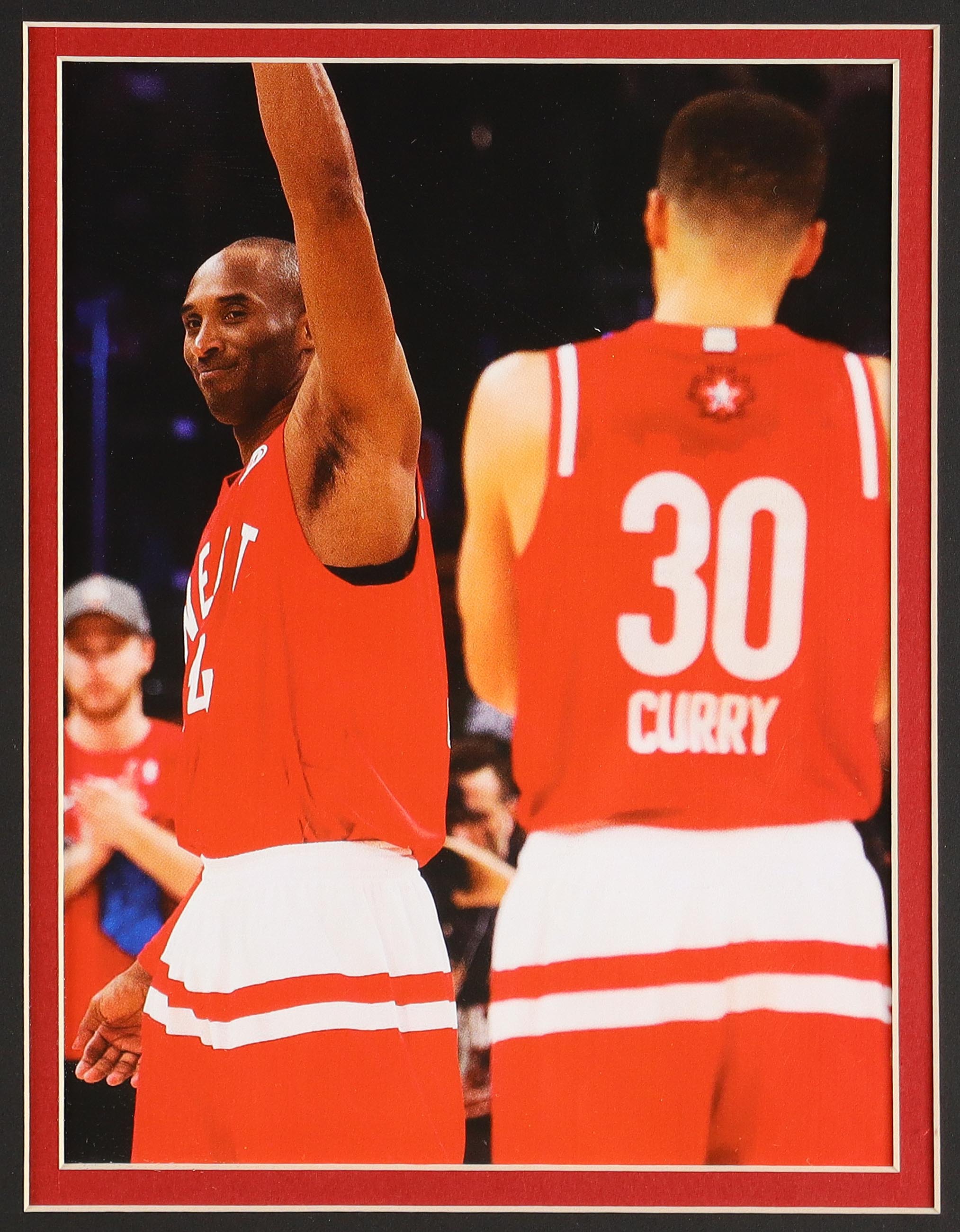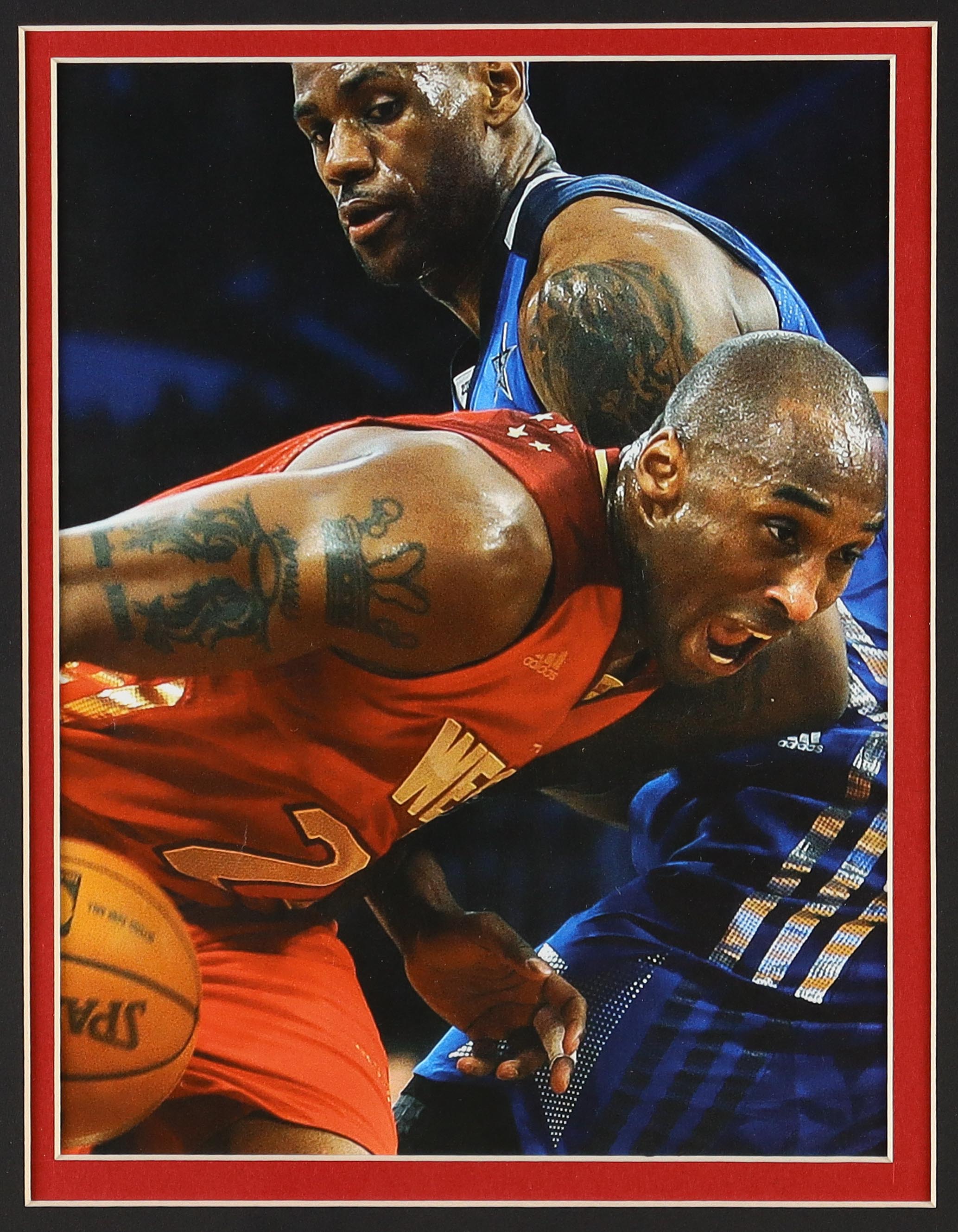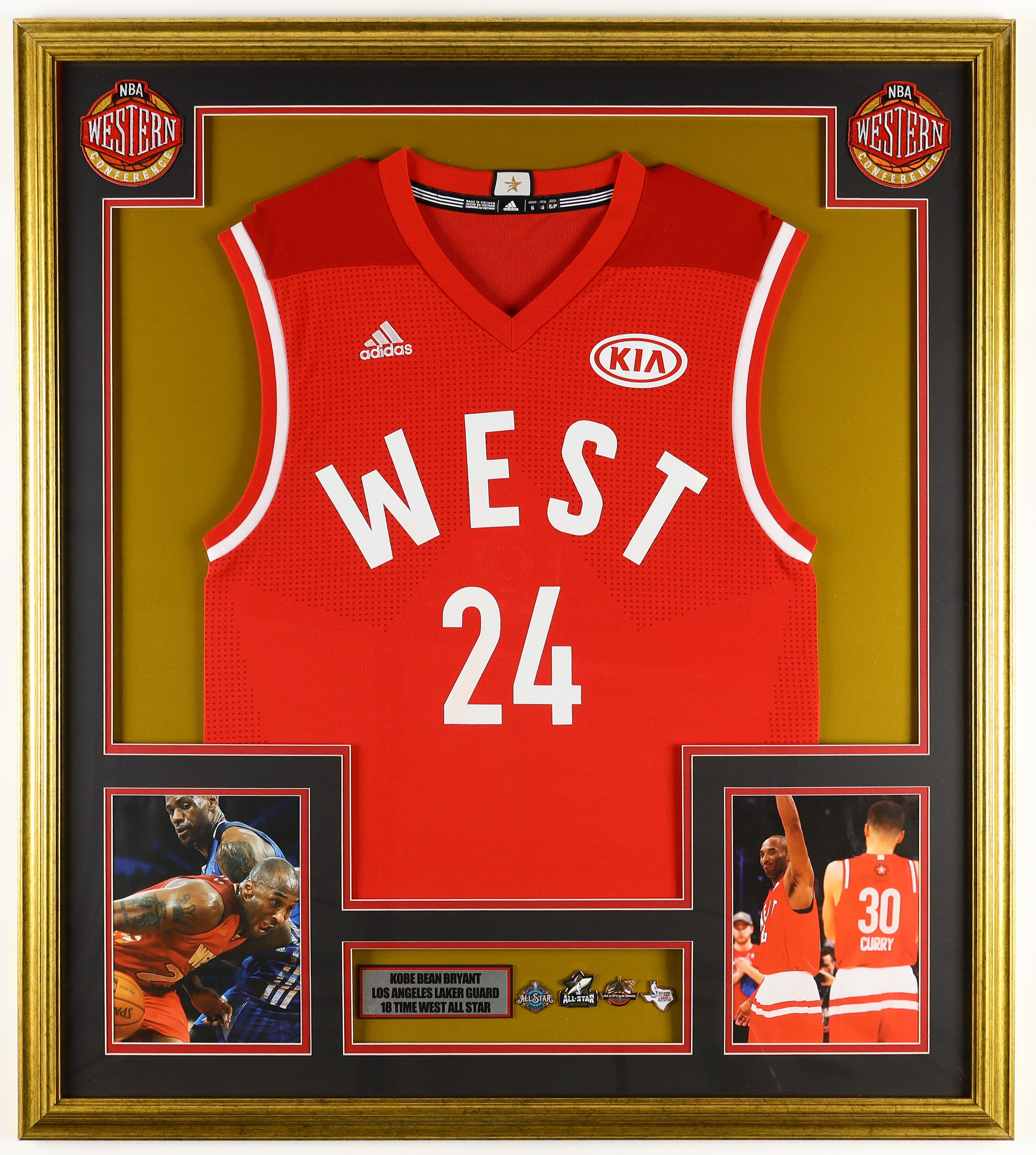 Custom frame measures 33" x 37" in size and features an unsigned Adidas Kobe Bryant (D. 2020, HOF) jersey. The display also includes (4) All-Star Game pins, (2) team Western Conference logo patches as well as (2) photos. Please note, the display is unsigned.