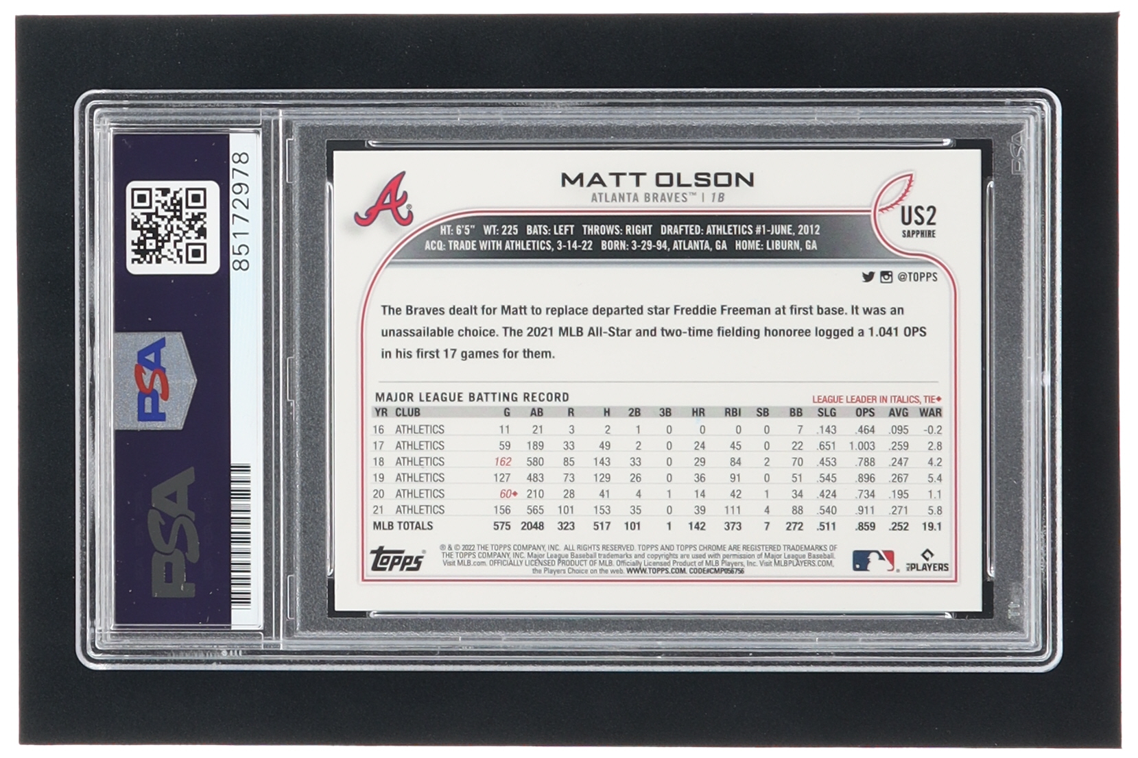 Matt Olson Signed 2022 Topps Chrome Update Sapphire #US2 (PSA)