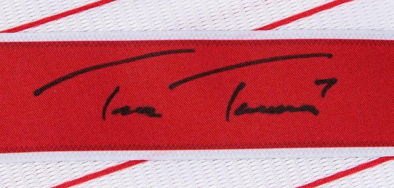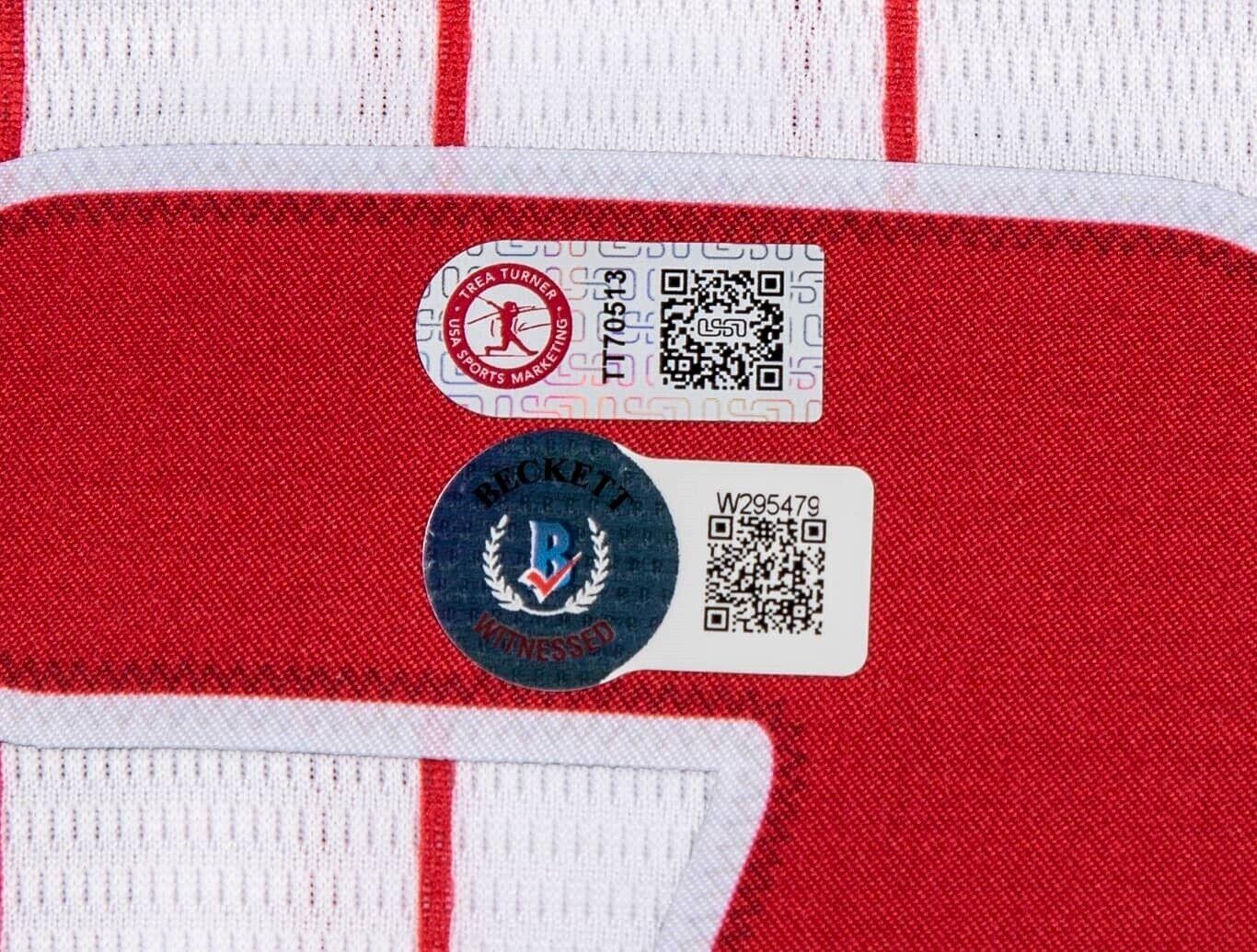 The autograph includes an official Beckett Authentication Services serially numbered hologram for authenticity purposes. The signing of this item was witnessed by Beckett and includes an official USA Sports Marketing Trea Turner hologram and COA for authenticity purposes.