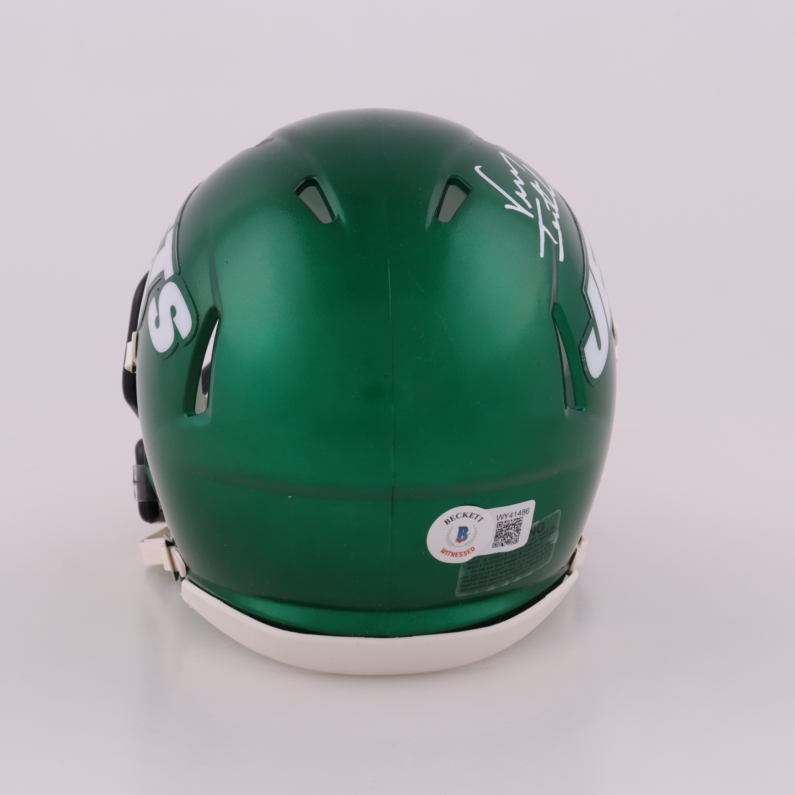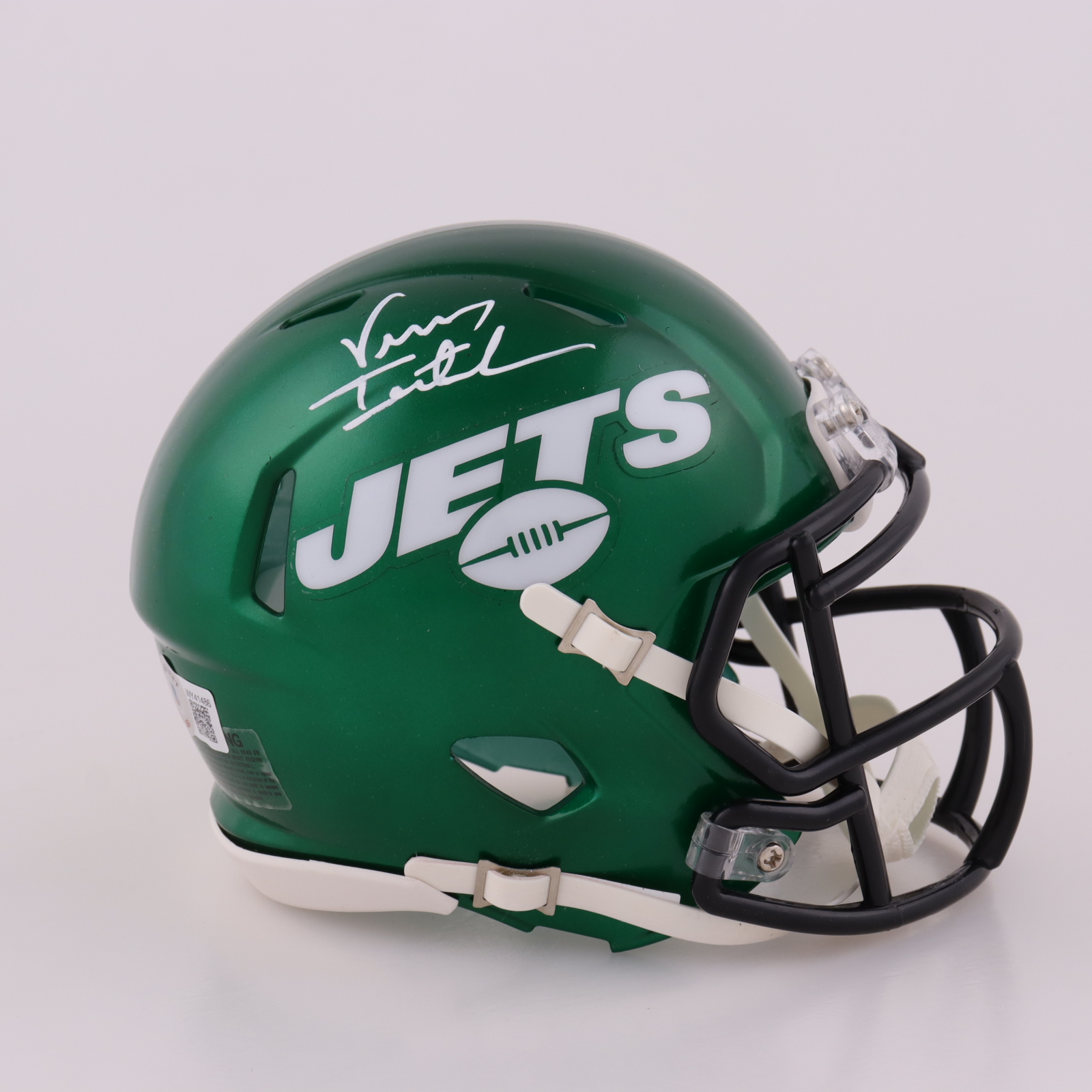 Riddell New York Jets Speed Mini Helmet has been hand-signed by Vinny Testaverde.