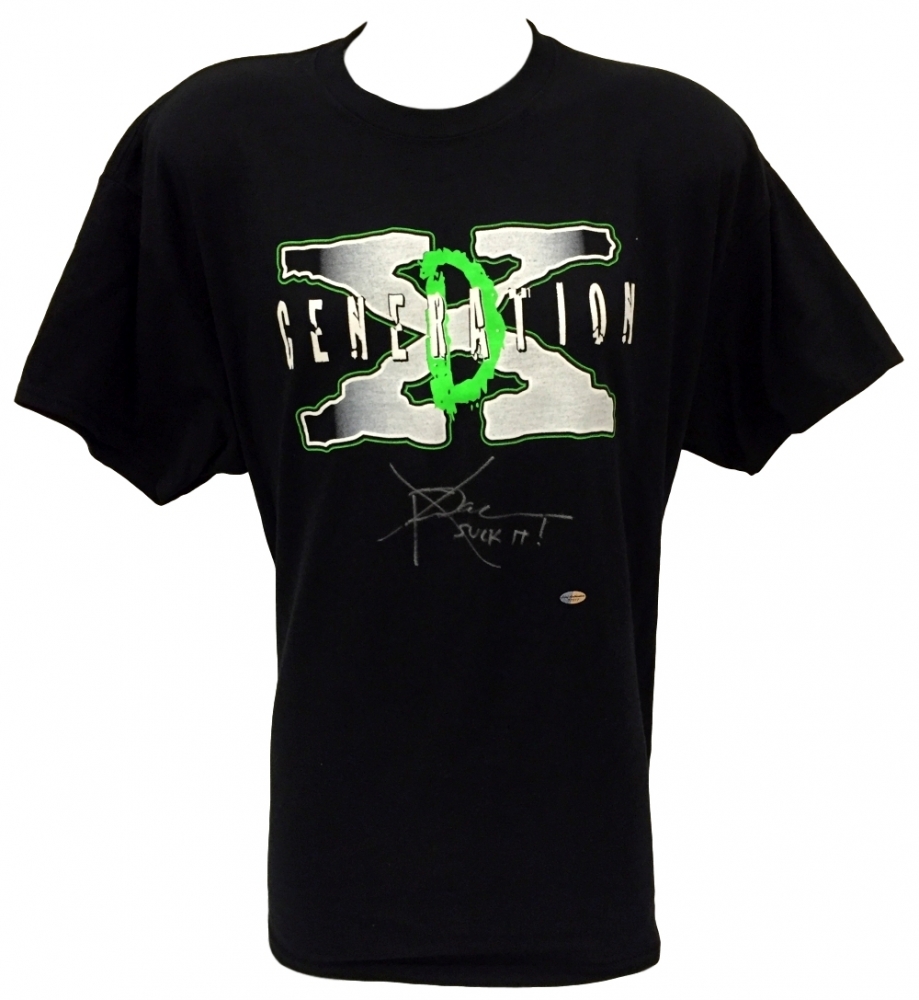 "D-Generation X" WWE t-shirt, size XL. Hand-signed and inscribed in silver paint pen by Sean "X-Pac" Waltman.