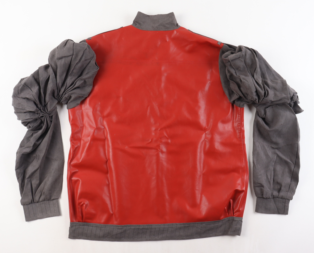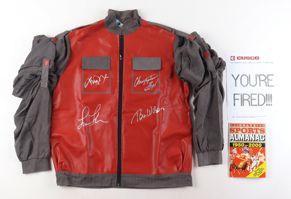 Custom faux leather/suede jacket, Size M. Jacket has been hand-signed by Michael J. Fox. (Marty McFly), Christopher Lloyd (Doc Brown), Lea Thompson (Lorraine Baines), and Tom Wilson (Biff Tannen). Jacket also comes with a replica "Grays" sports almanac and a Cusco "You're Fired!!!" sheet of paper. Please note, the almanac is not a full replica but rather a small booklet with (3) pages.