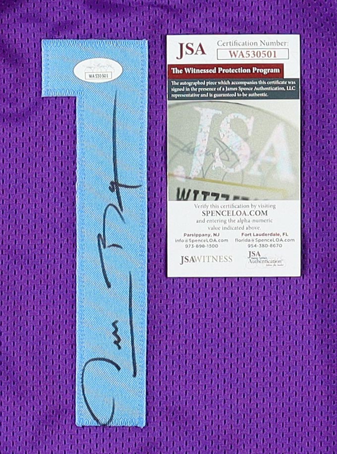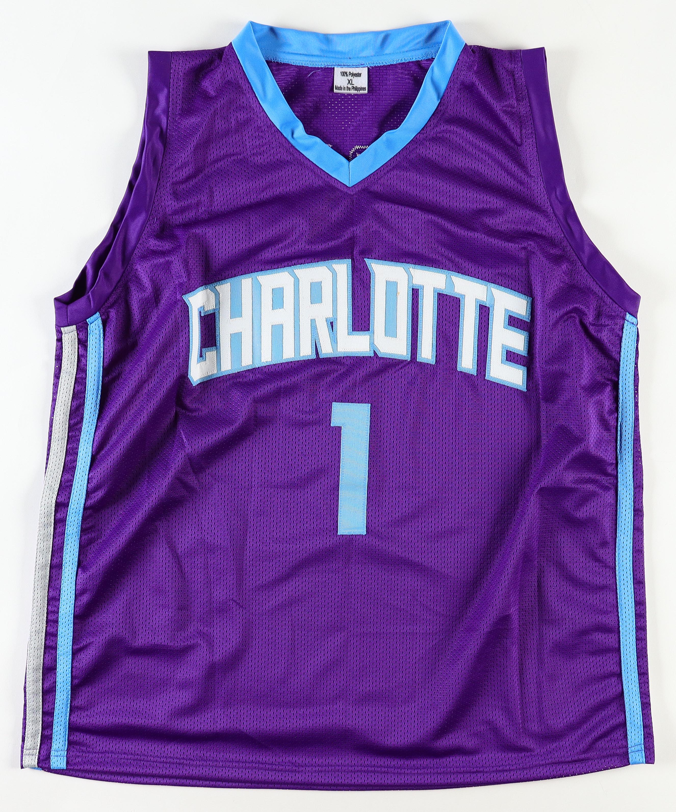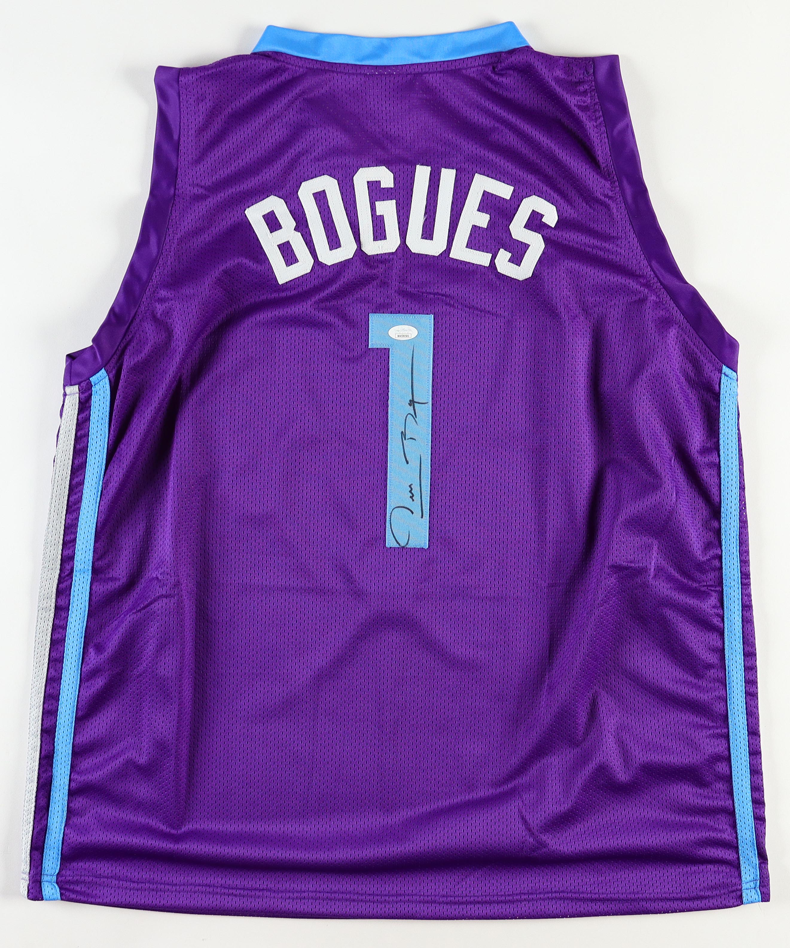 Custom jersey with everything sewn on, size XL. Hand-signed by Muggsy Bogues.