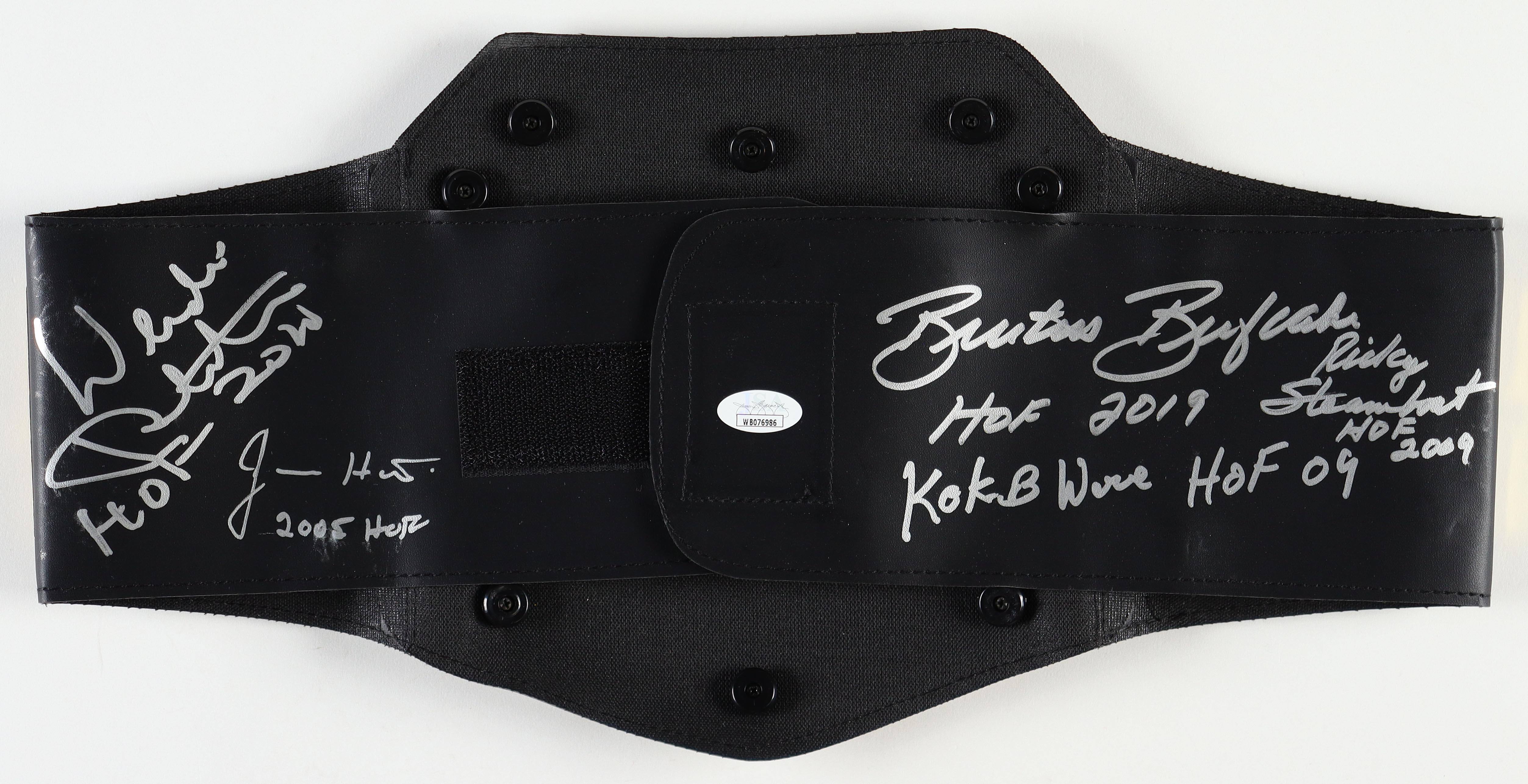 WWE plastic toy replica championship belt. Measures approximately 39" in length. Hand-signed and inscribed by Ricky Steamboat (HOF), Jimmy Hart (HOF), Wendi Richter (HOF), Brutus Beefcake (HOF), KoKo B. Ware (HOF). Please note, one of the inscriptions is smudged. See photos for more details.