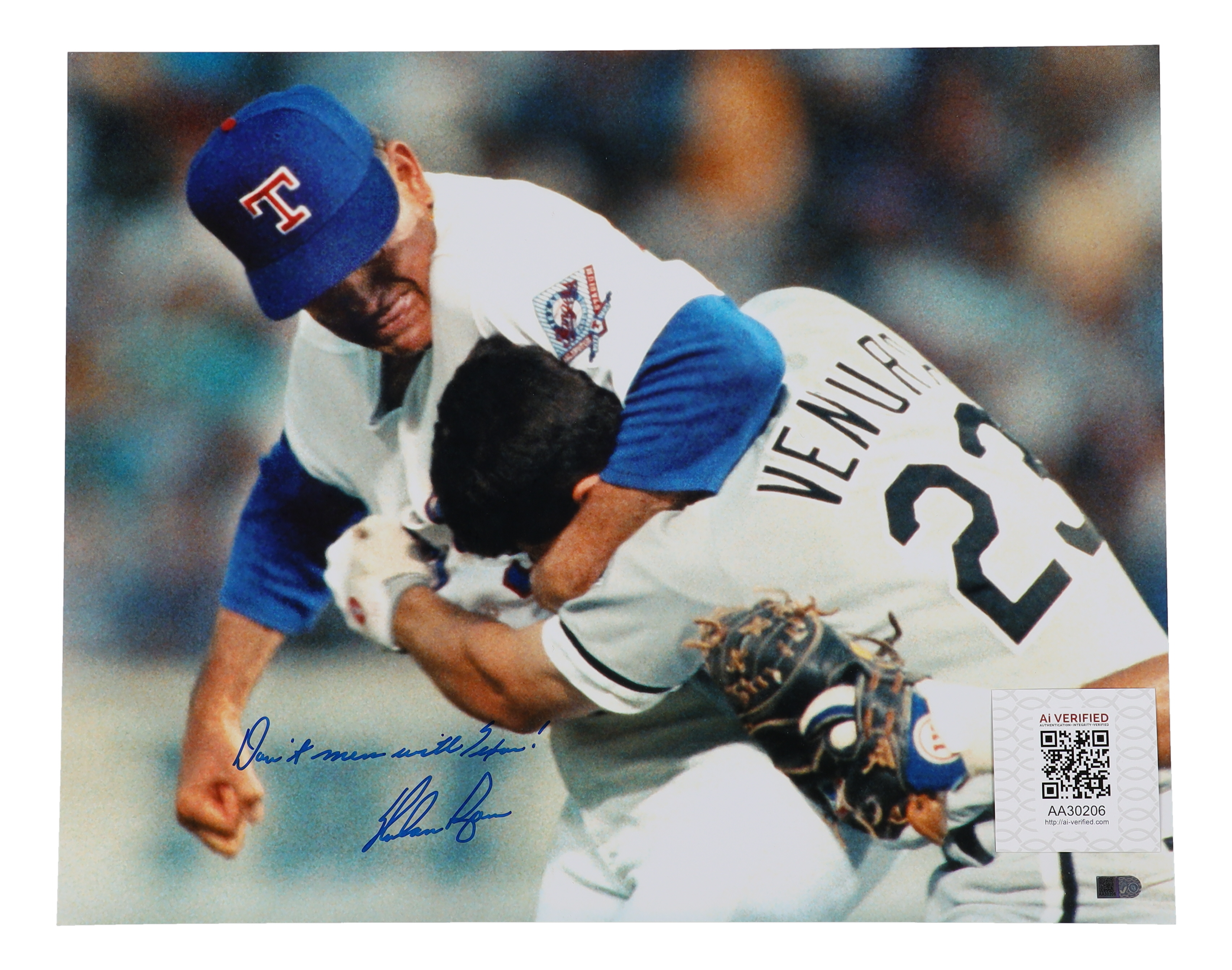 Photo measures 16" x 20" in size. Hand-signed and inscribed by Nolan Ryan (Texas Rangers, HOF).