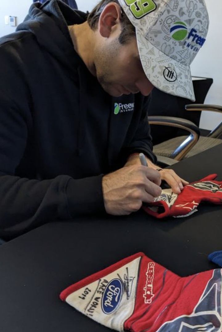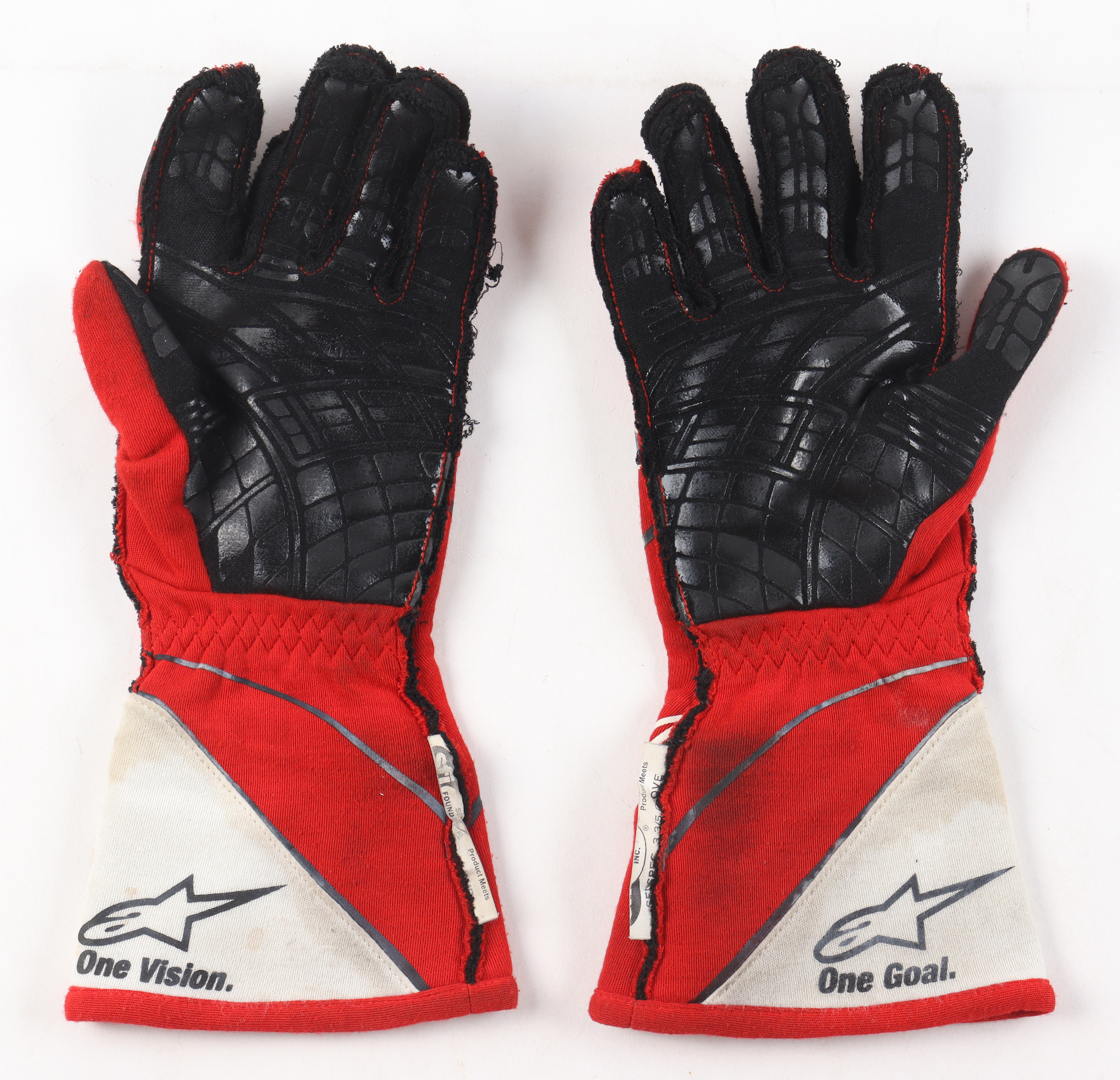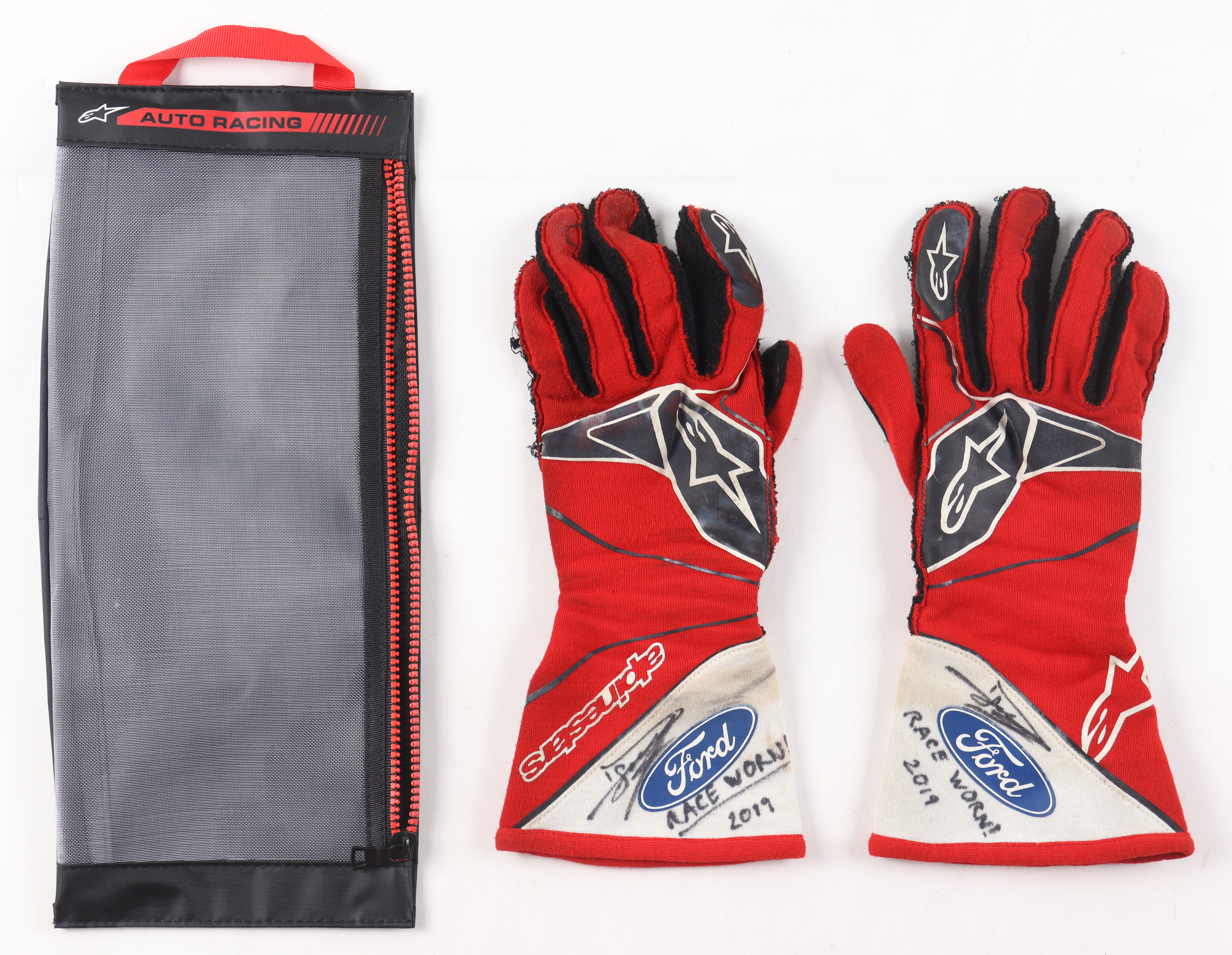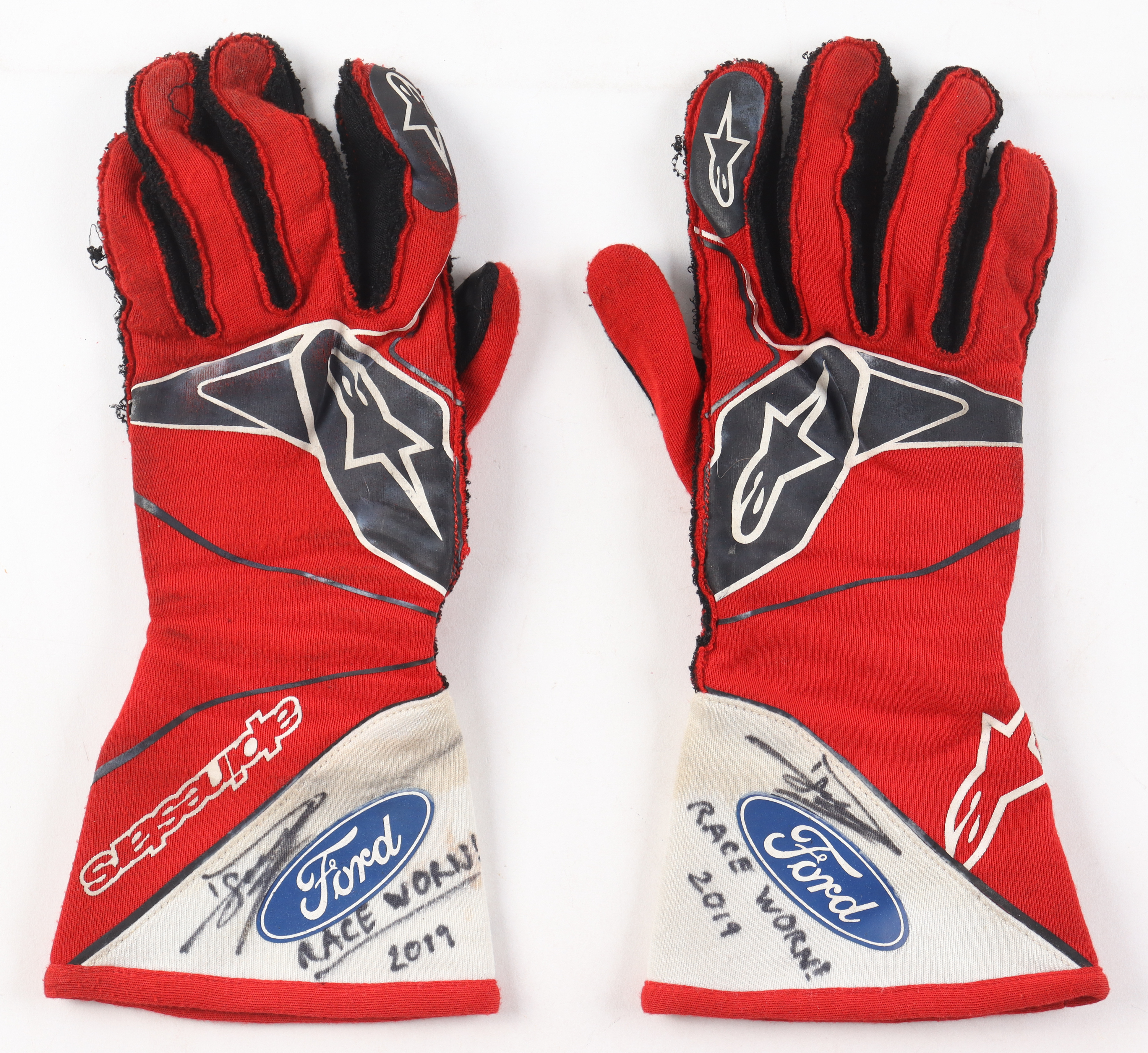 These gloves come directly from Daniel Suarez's collection. The gloves were race worn by Suarez during the 2019 NASCAR Cup Series season. Both gloves are signed by Suarez along with the inscription "Race Worn 2019".