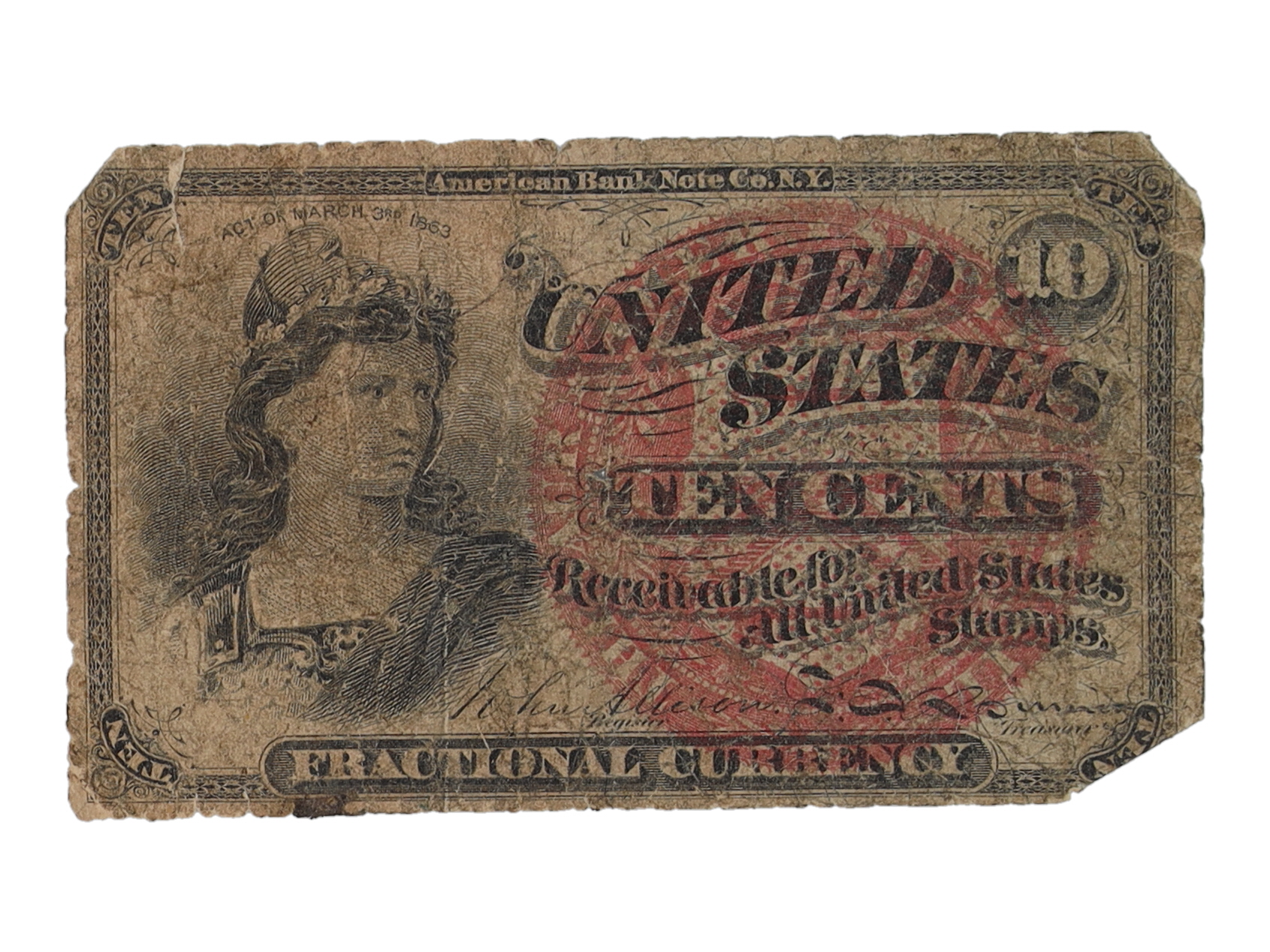 Fractional currency, also referred to as shinplasters, was introduced by the United States federal government following the outbreak of the Civil War. These fractional notes were in use between 21 August 1862 and 15 February 1876, and issued in 3, 5, 10, 15, 25, and 50 cent denominations across five issuing periods.