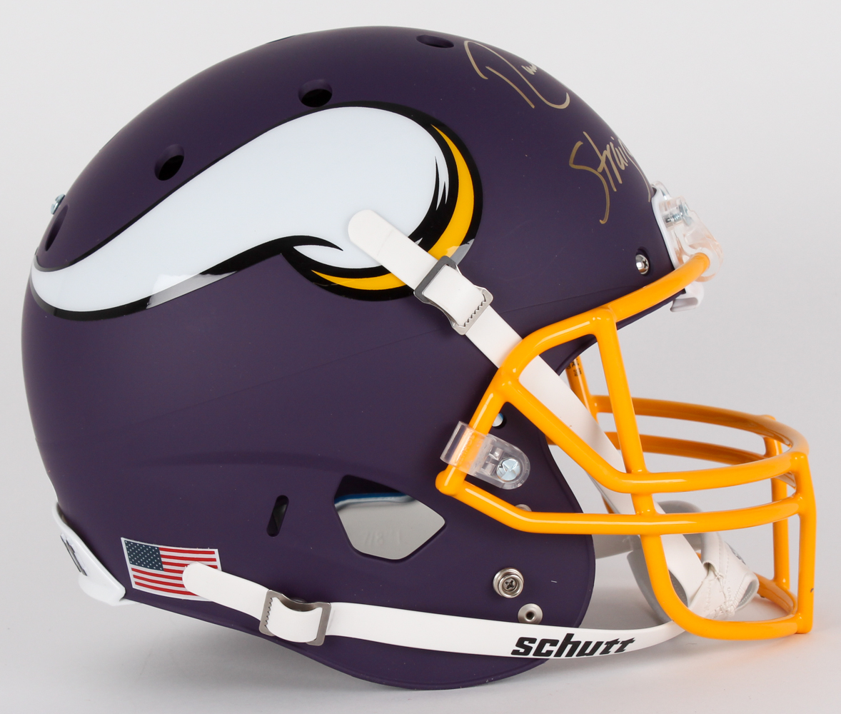 Schutt full-size replica helmet has been hand-signed and inscribed in gold paint pen by Randy Moss (Patriots).