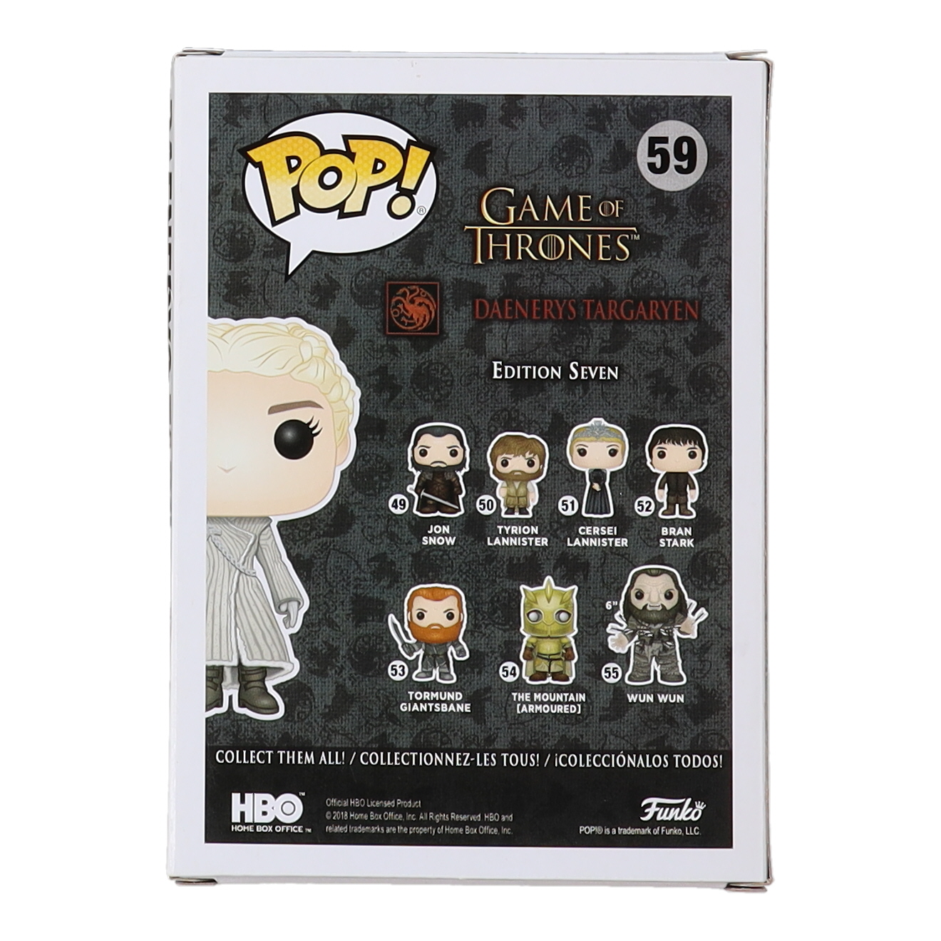 Funko Pop! vinyl figure measures approximately 4" tall and has been hand-signed on the packaging by Emilia Clarke (Daenerys Targaryen).