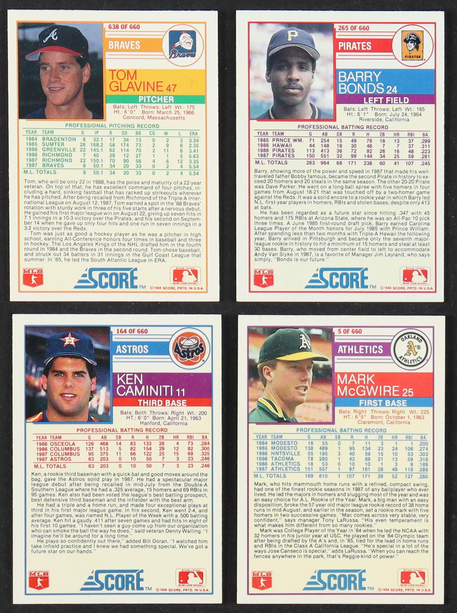 1988 Score Baseball Complete Set of (660) Cards with Tom Glavine #638 RC, Mark McGwire #5, Ken Caminiti #164 RC, Barry Bonds #265