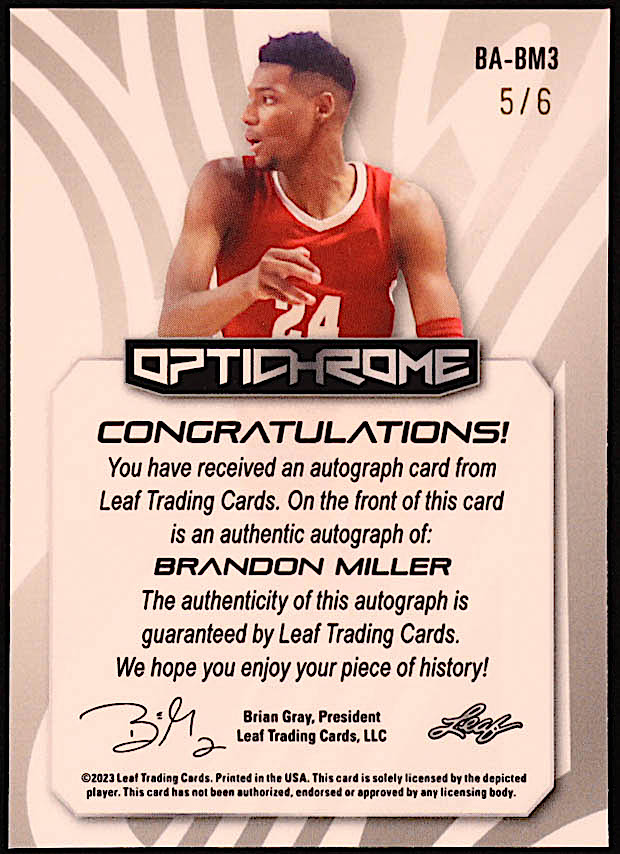 Brandon Miller 2022-23 Leaf Optichrome Signature Series Purple Mojo #BABM3 RC #5/6